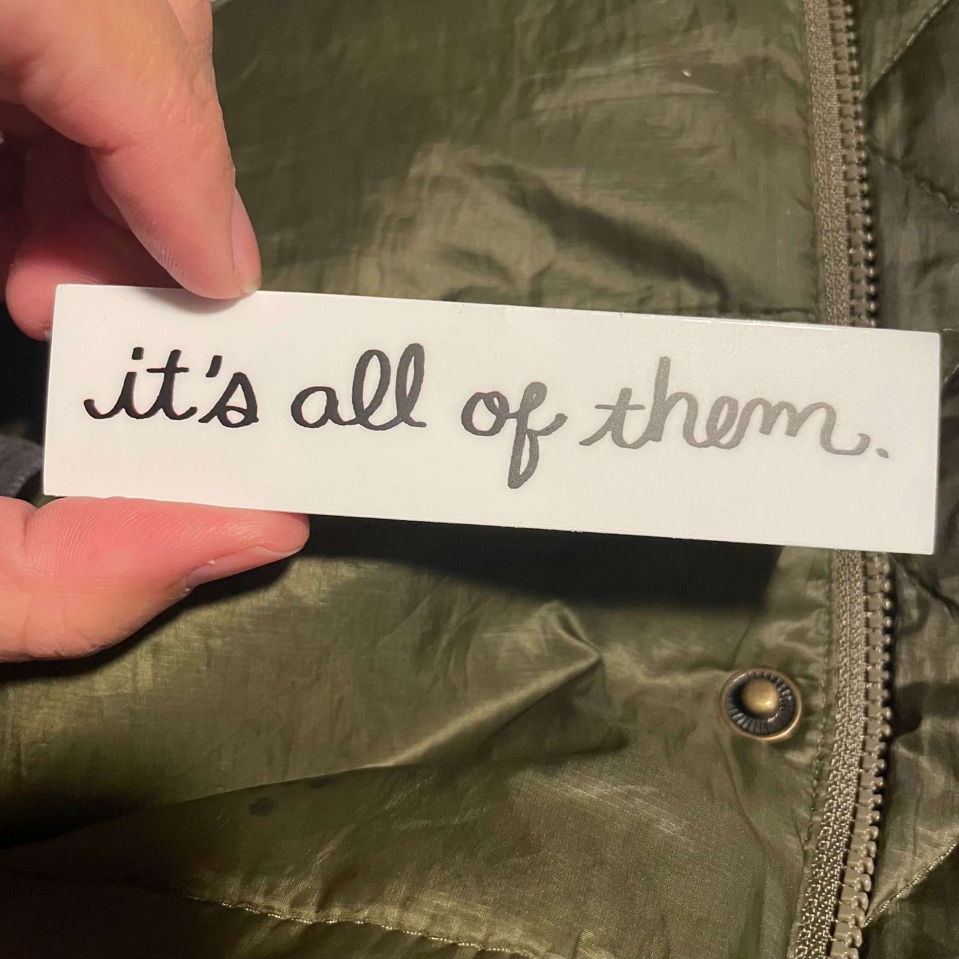 2” white sticker with “it’s all of them” written in cursive. Great for sticking on stuff.