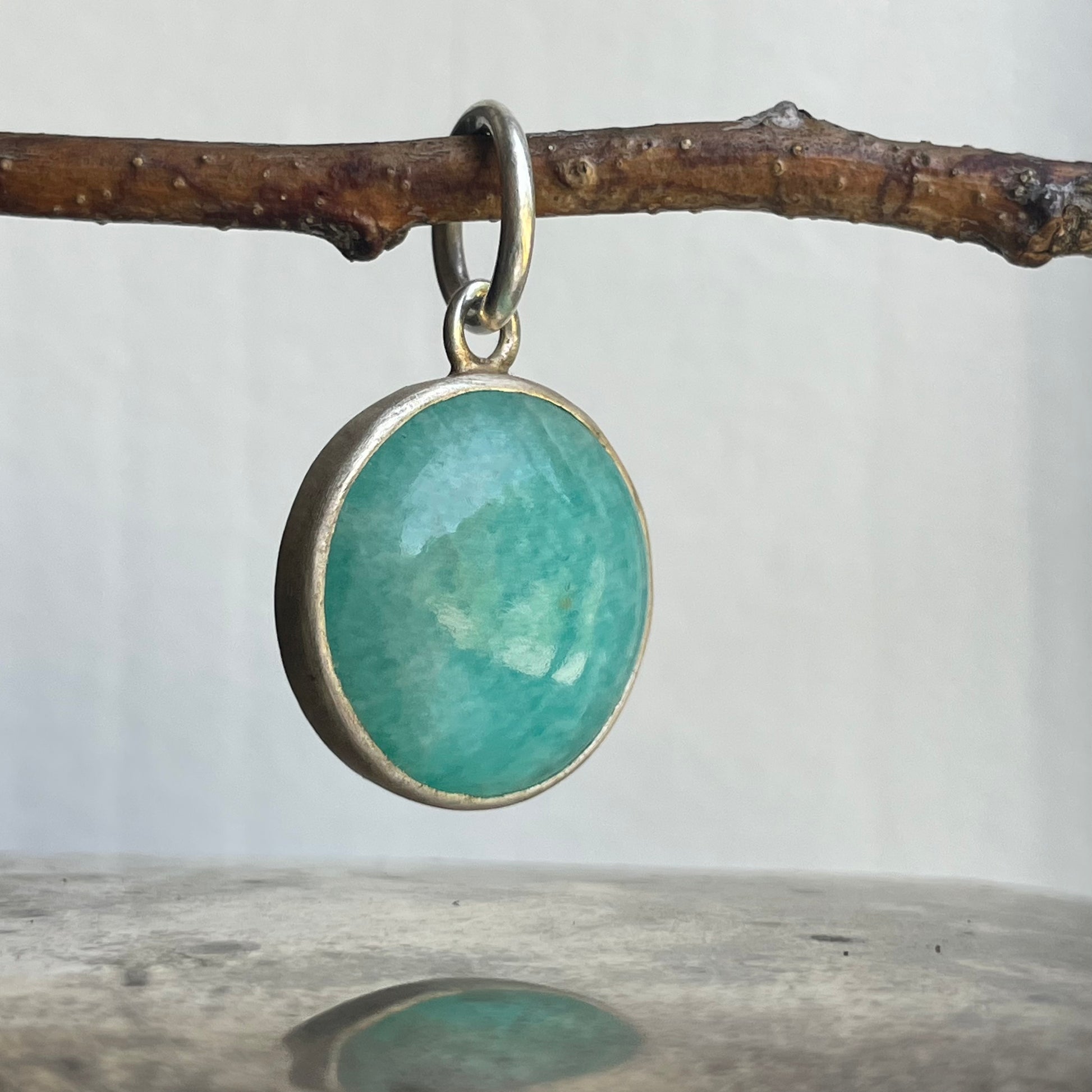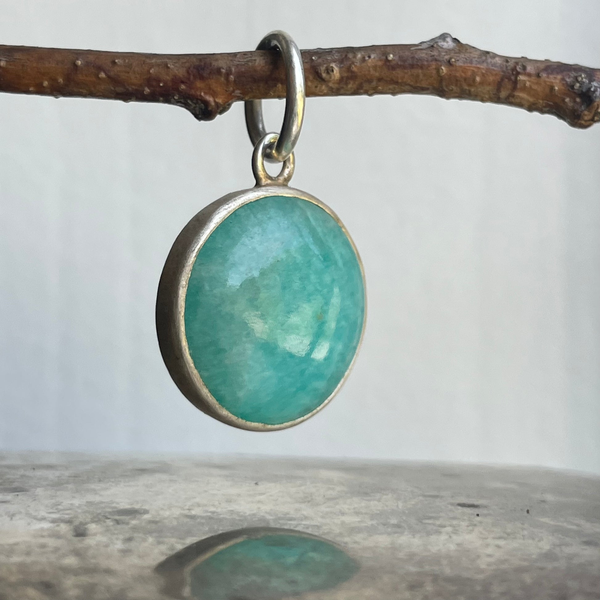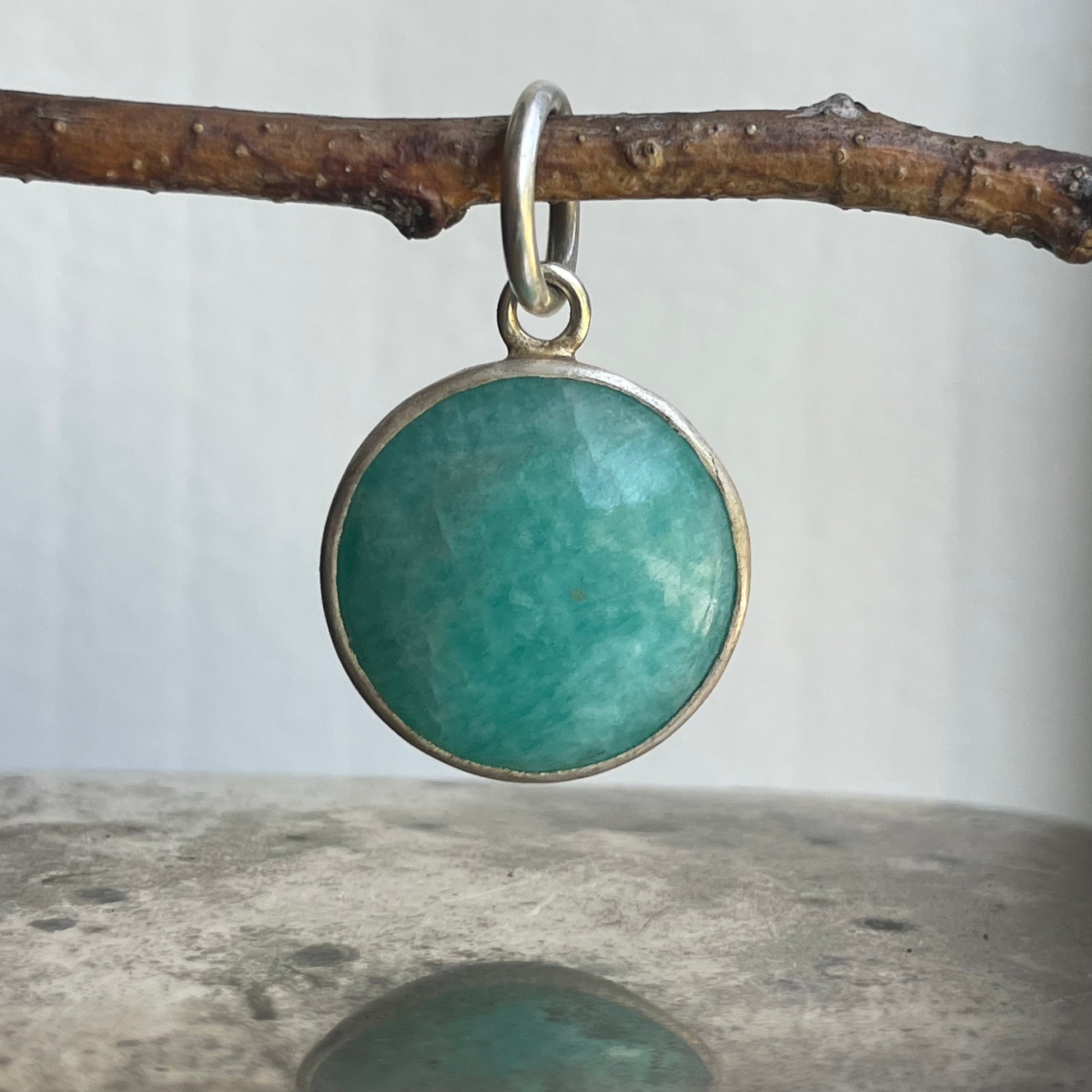 This exclusive Amazonite Pendant features a 20mm Amazonite Cabochon, bezel set in matte finish sterling silver. The back is imprinted with 925 as a stamp of the sterling's authenticity and durability. Designed in Massachusetts and handcrafted in India, with high-quality materials and ethically sourced stones.