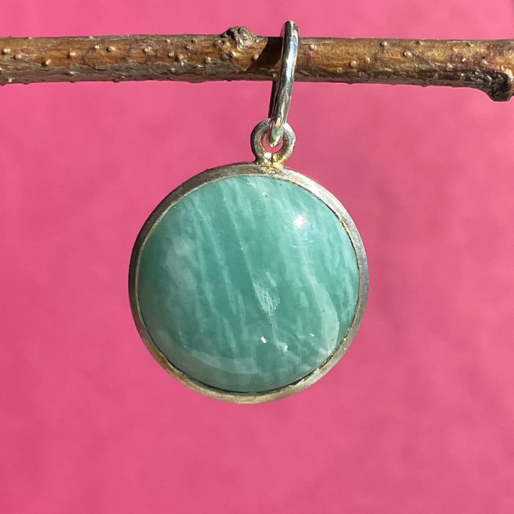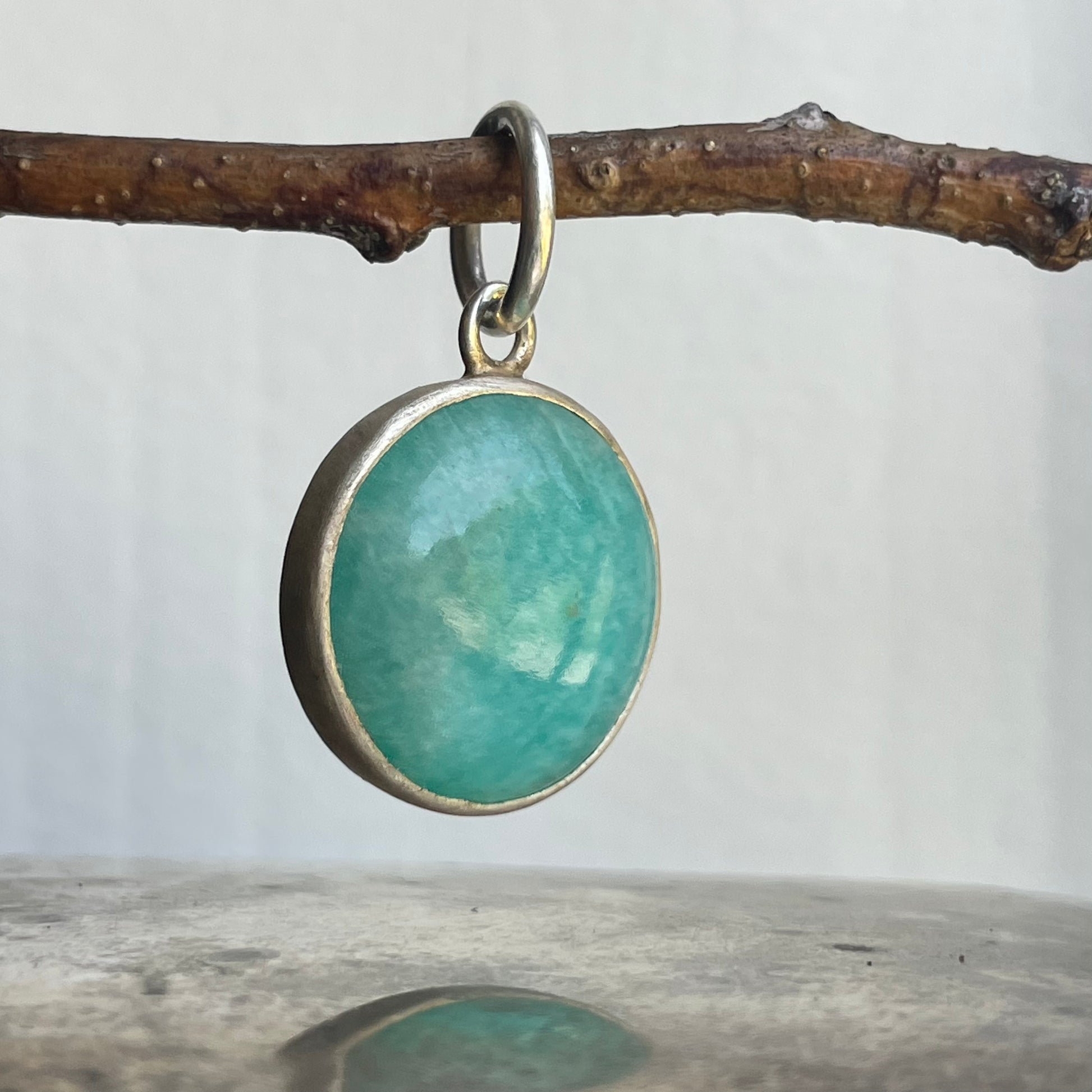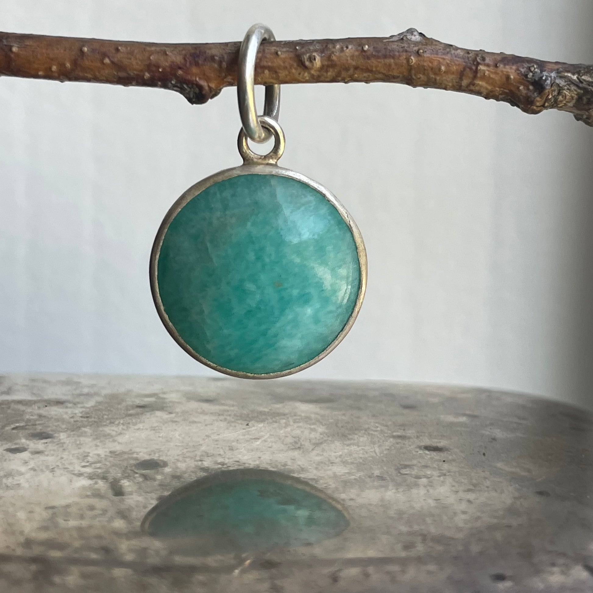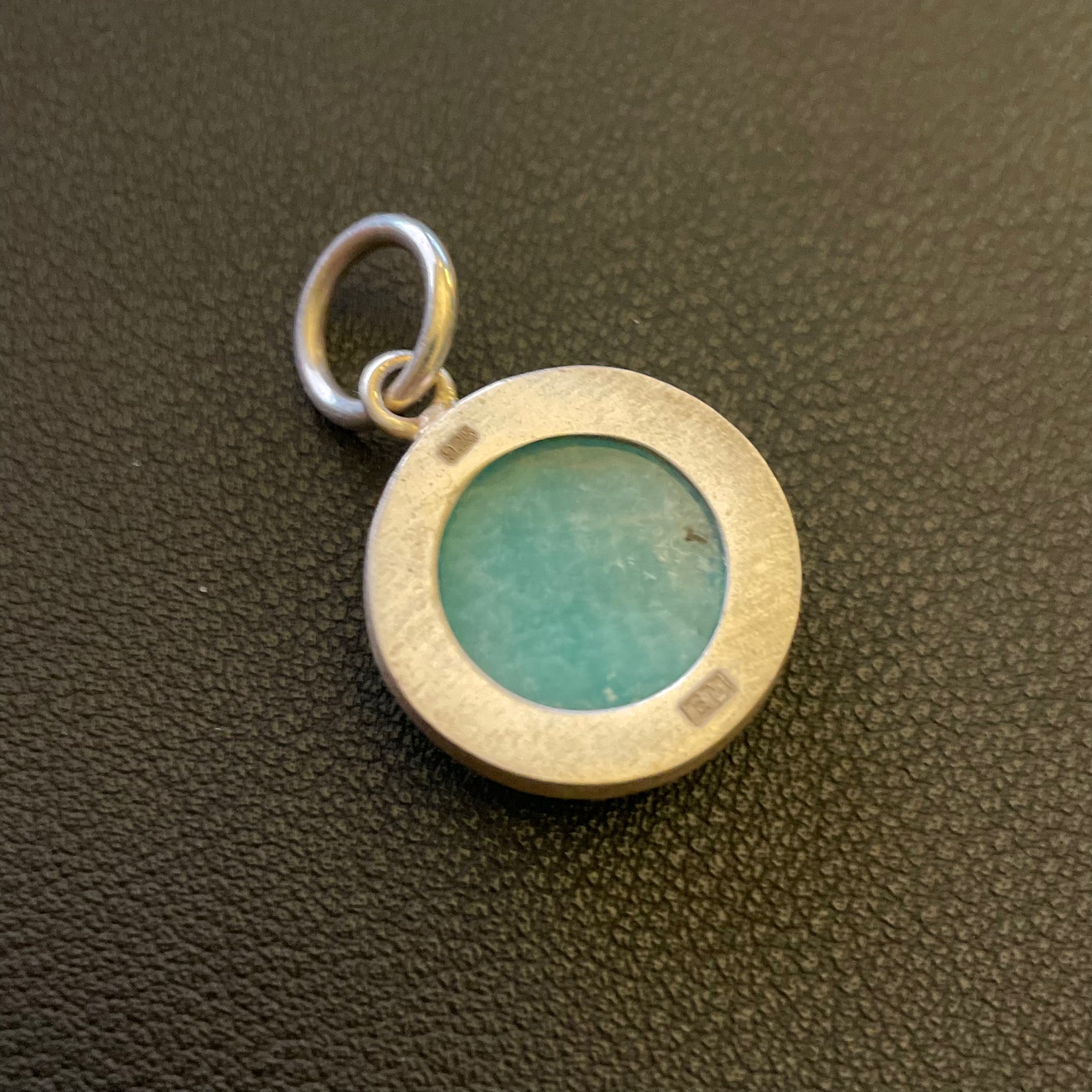 This exclusive Amazonite Pendant features a 20mm Amazonite Cabochon, bezel set in matte finish sterling silver. The back is imprinted with 925 as a stamp of the sterling's authenticity and durability. Designed in Massachusetts and handcrafted in India, with high-quality materials and ethically sourced stones.