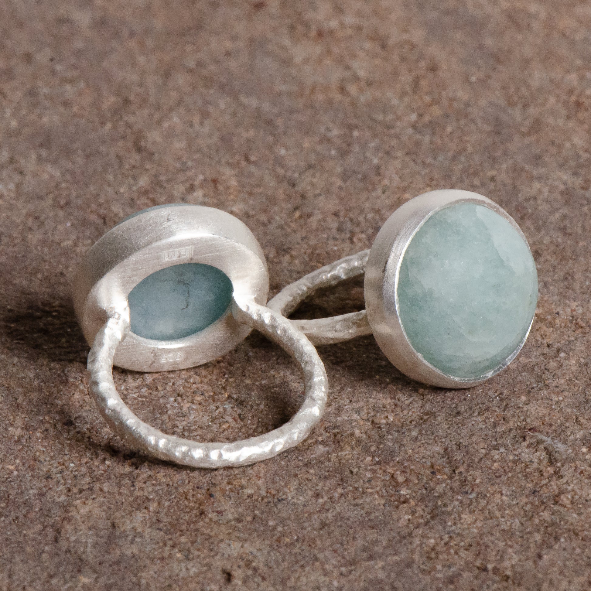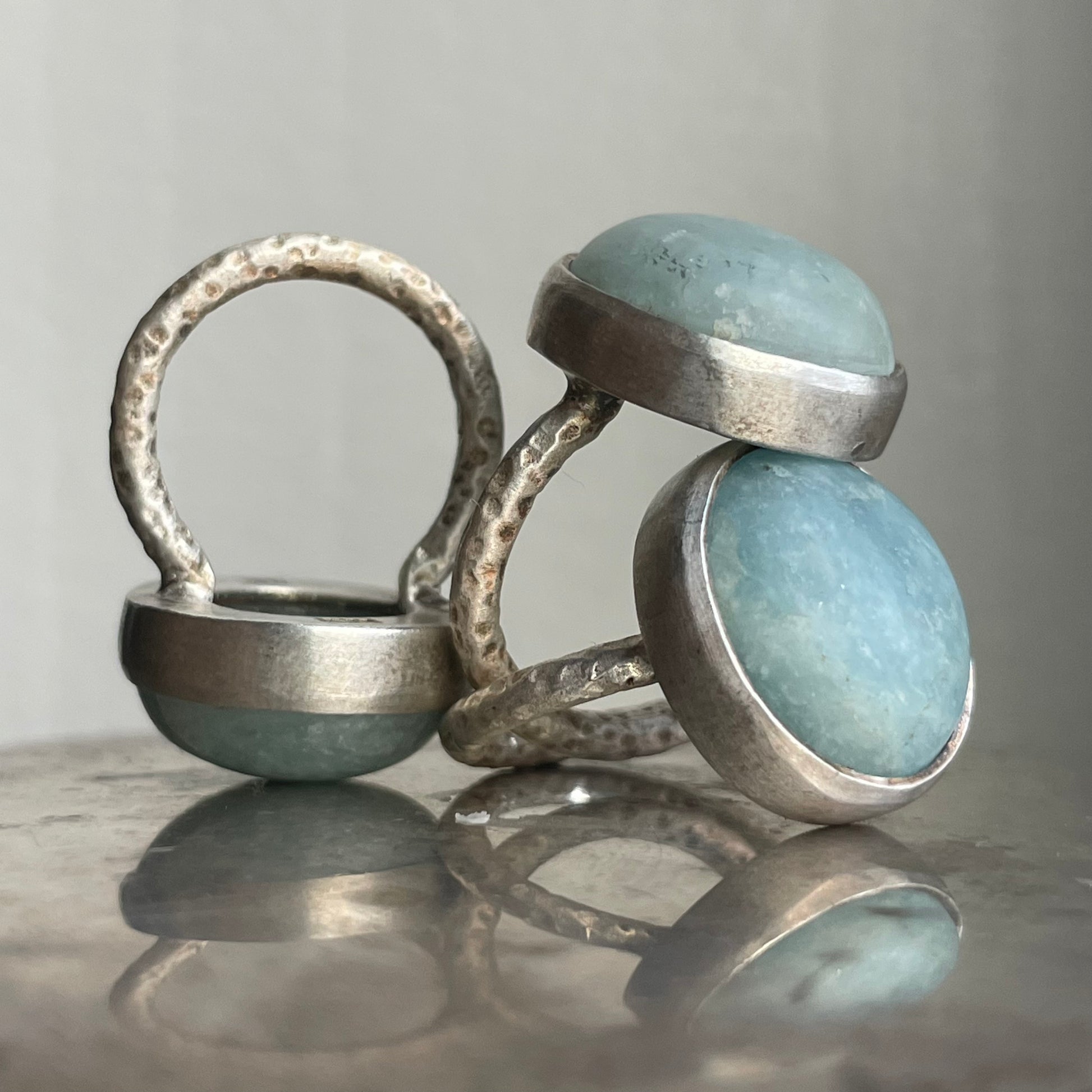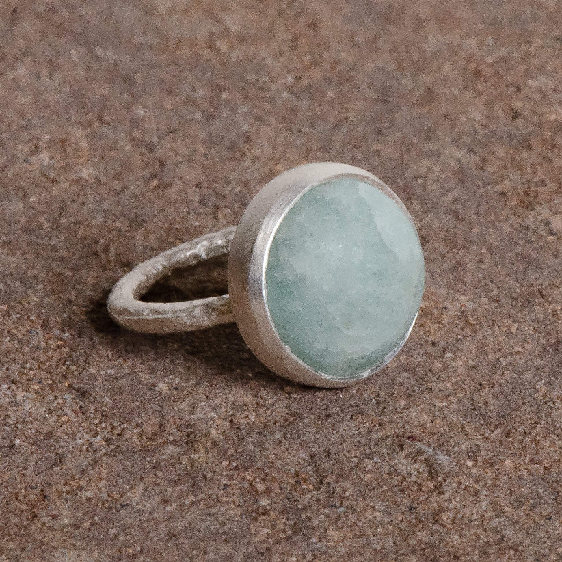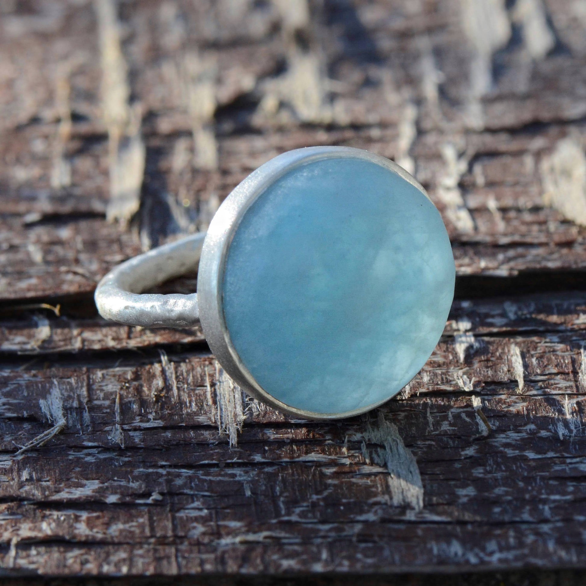 This exclusive Aquamarine Matte Ring features a 16mm Aquamarine Cabochon. Bezel set in matte finish sterling silver, on a 2mm round hammered band. The back is imprinted with 925 as a stamp of the sterling's authenticity and durability. Available in whole and half sizes. Designed in Massachusetts and handcrafted in India, with high quality materials and ethically sourced stones.