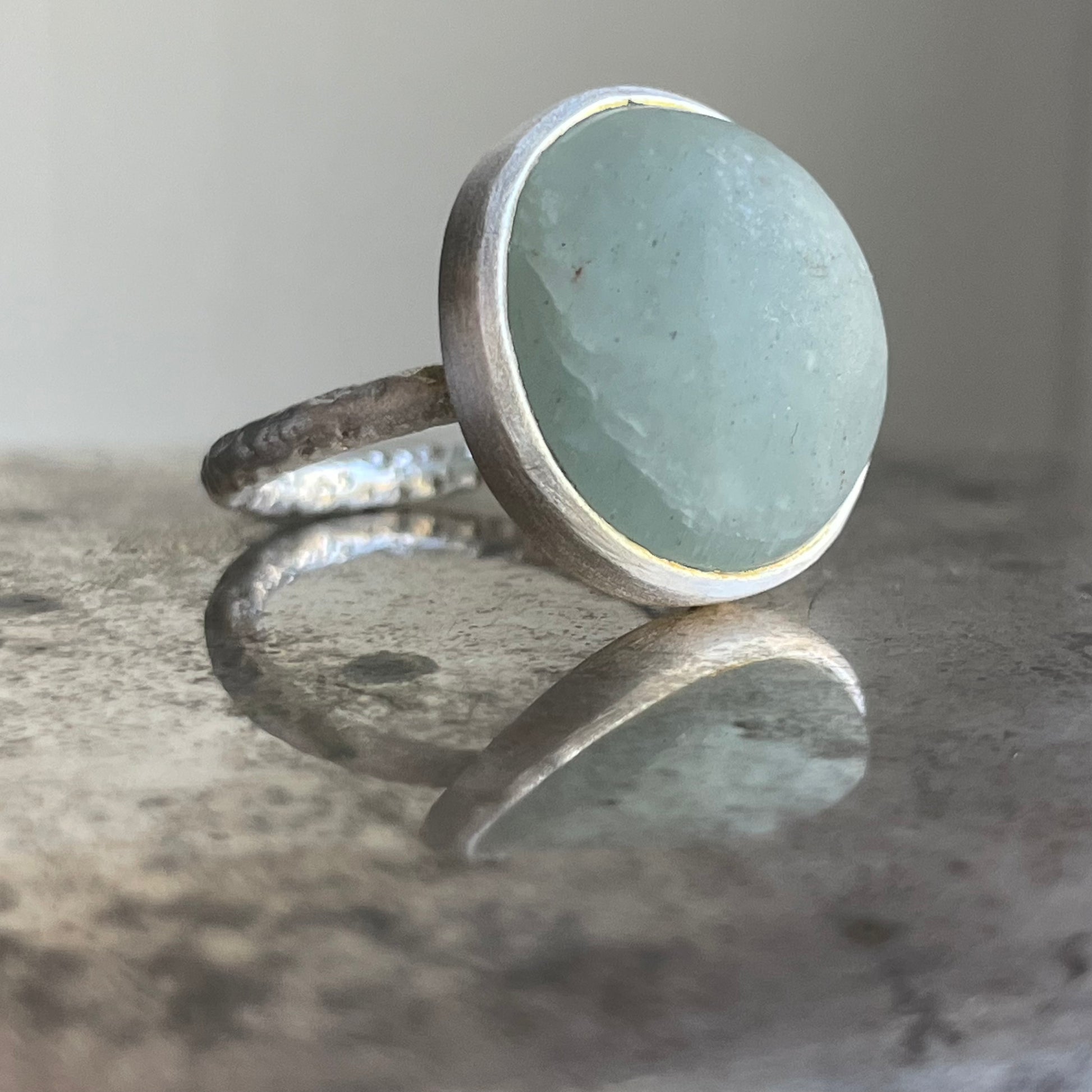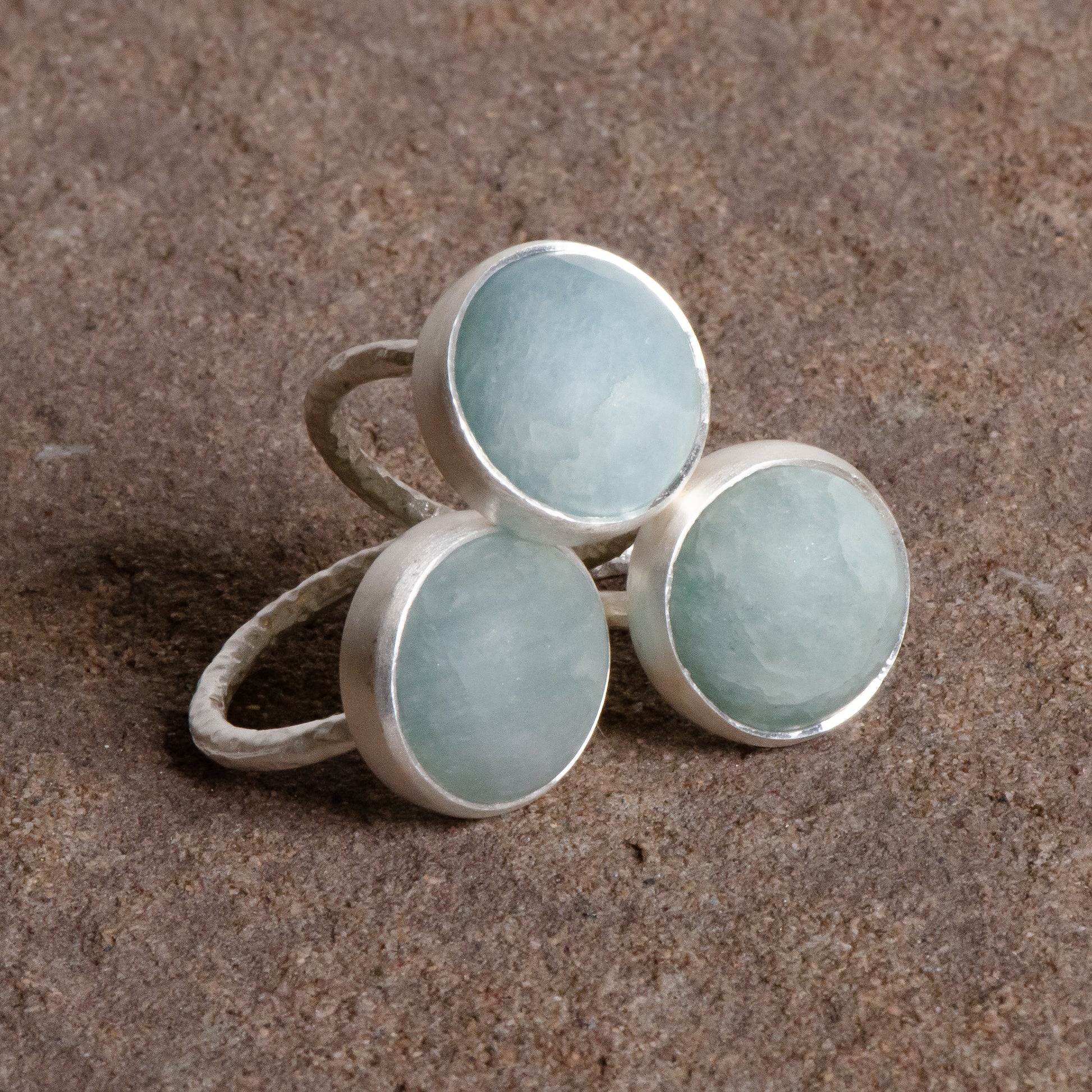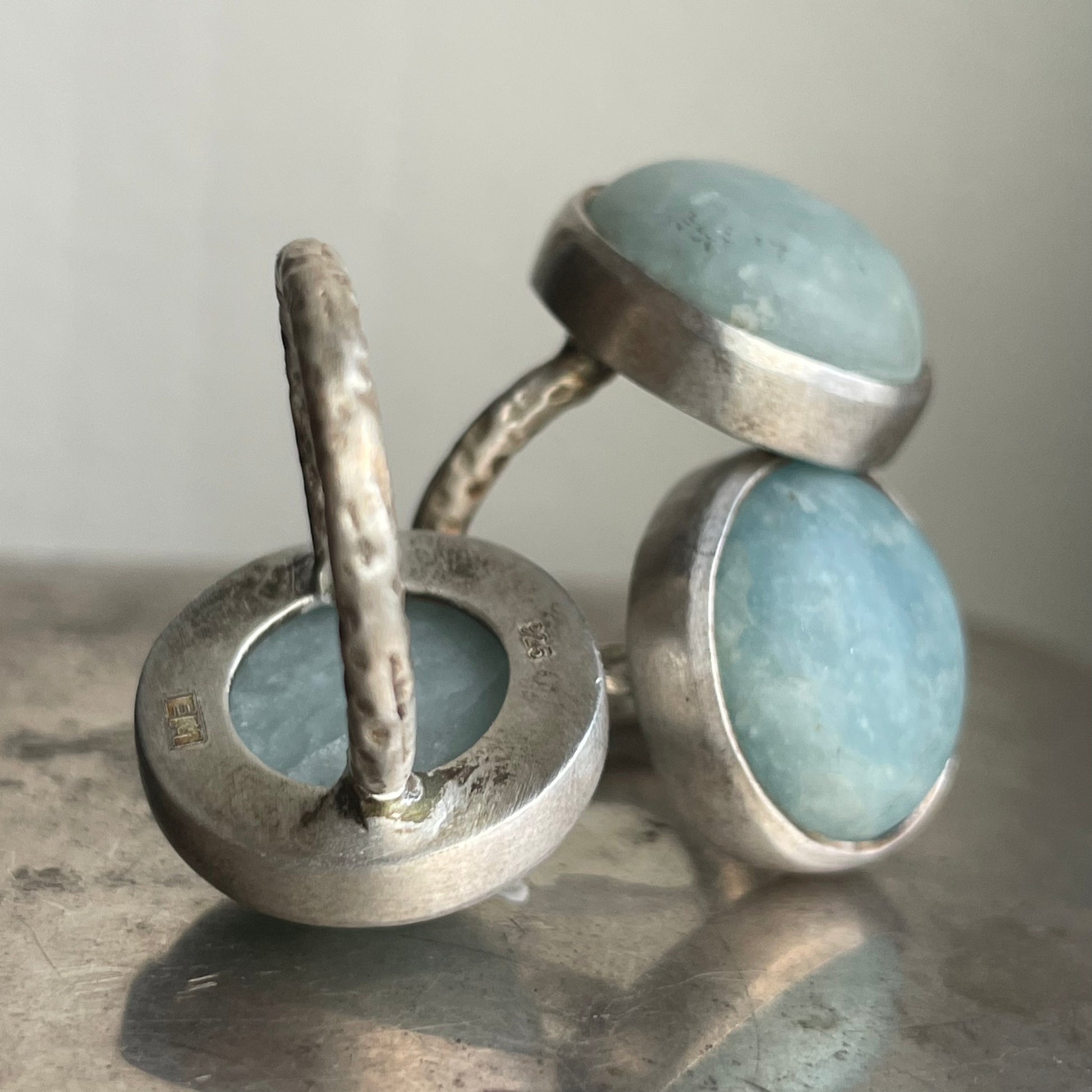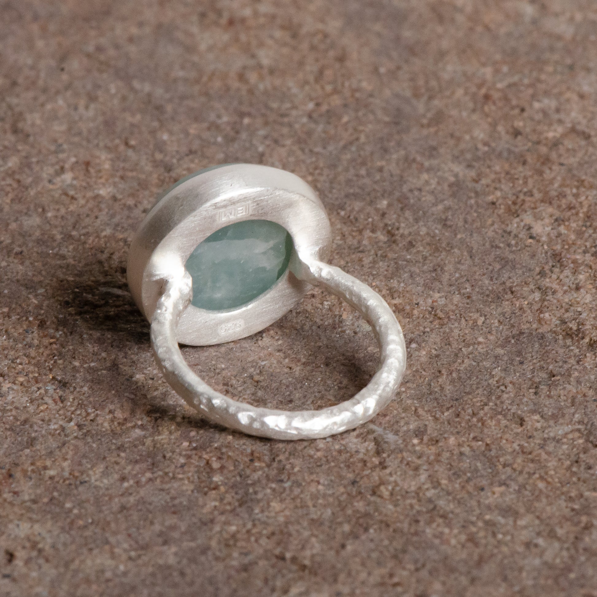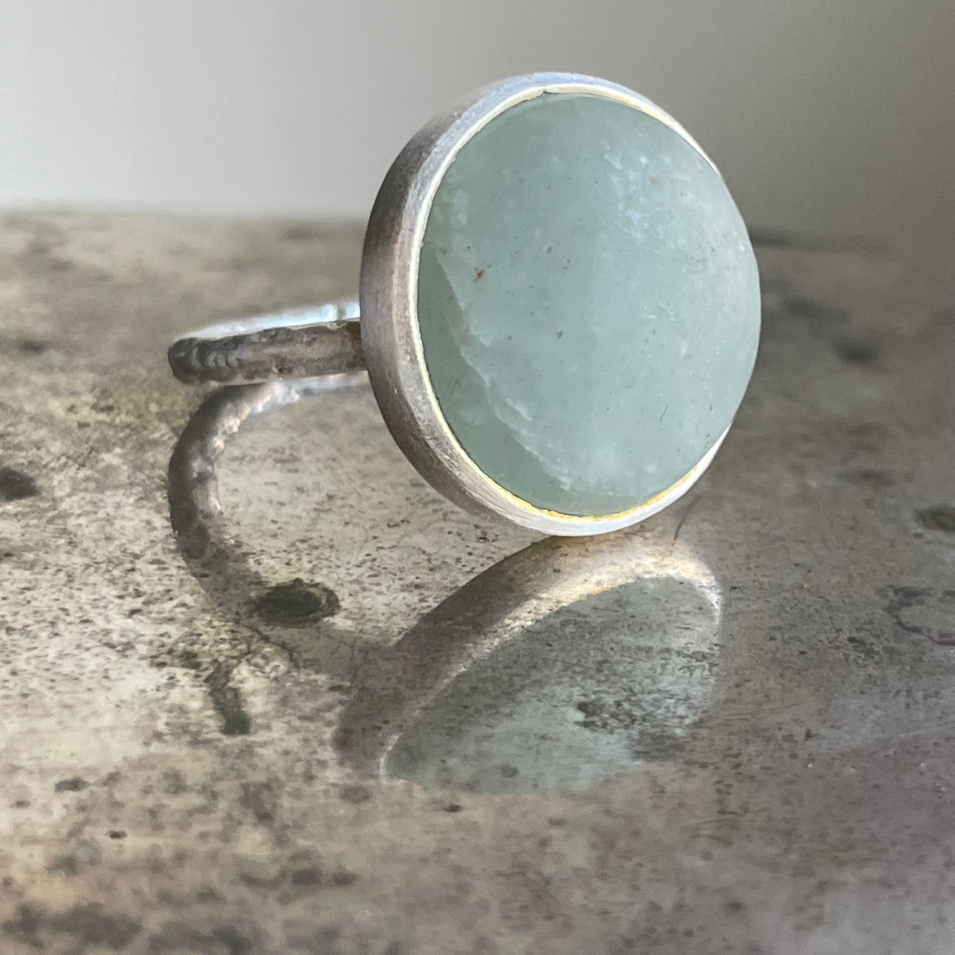 This exclusive Aquamarine Matte Ring features a 16mm Aquamarine Cabochon. Bezel set in matte finish sterling silver, on a 2mm round hammered band. The back is imprinted with 925 as a stamp of the sterling's authenticity and durability. Available in whole and half sizes. Designed in Massachusetts and handcrafted in India, with high quality materials and ethically sourced stones.