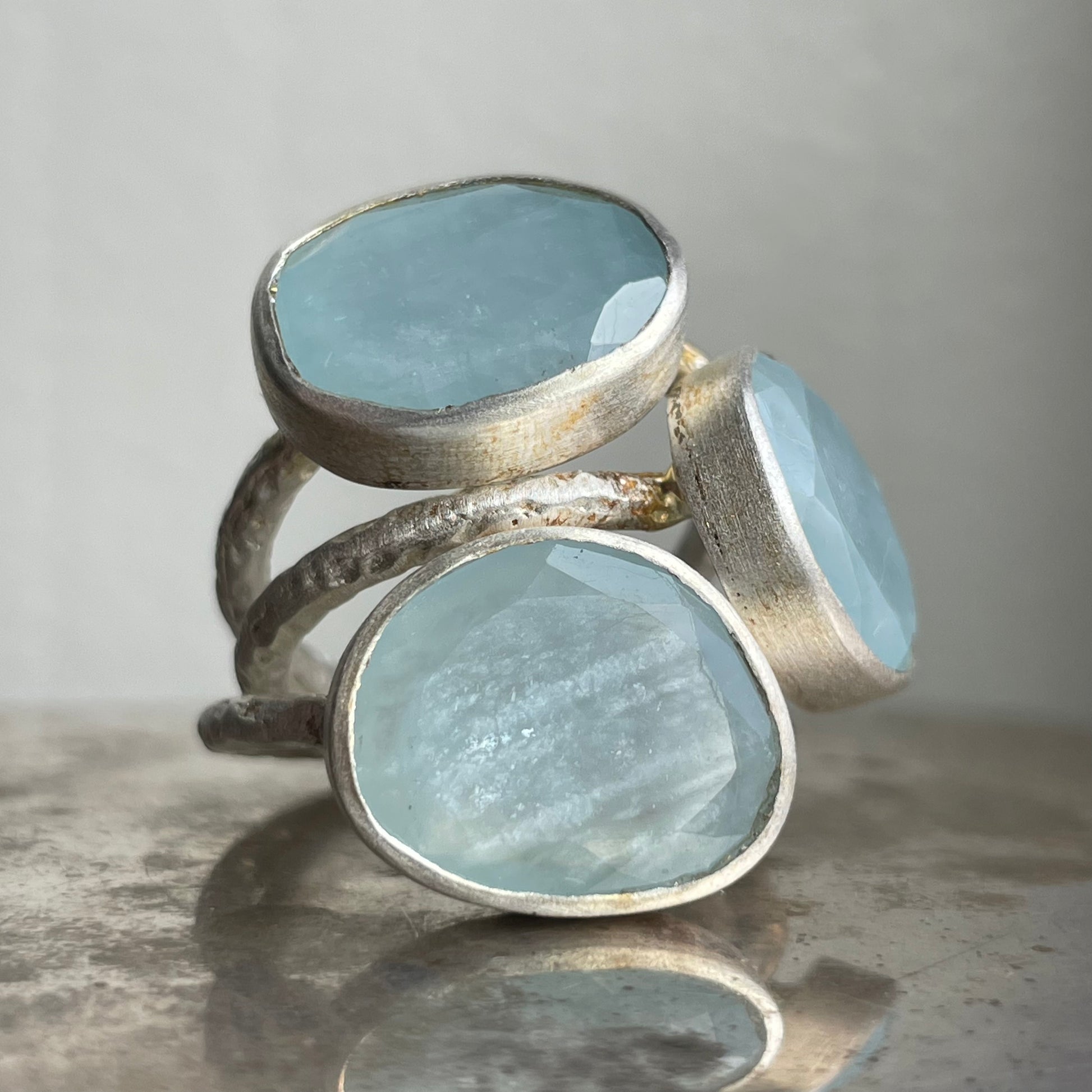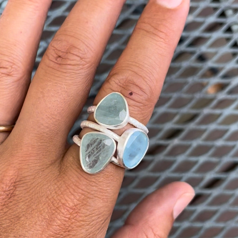 This exclusive Aquamarine Ring features a (roughly) 16mm x 10mm organically shaped Polki Cut Aquamarine. Bezel set in matte finish sterling silver, and set on a 2mm round hammered band, the back is imprinted with 925 as a stamp of the sterling's authenticity and durability. Available in whole and half sizes. No two shapes are exactly alike. Designed in Massachusetts and handcrafted in India, with high quality materials and ethically sourced stones.