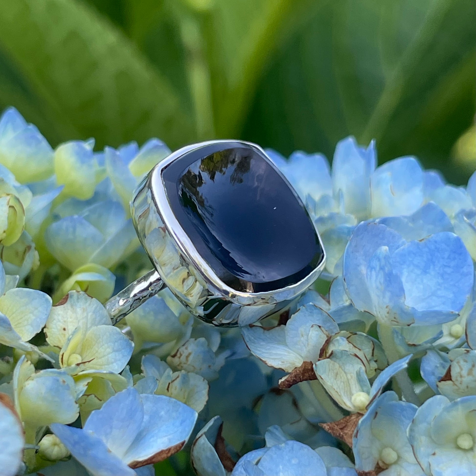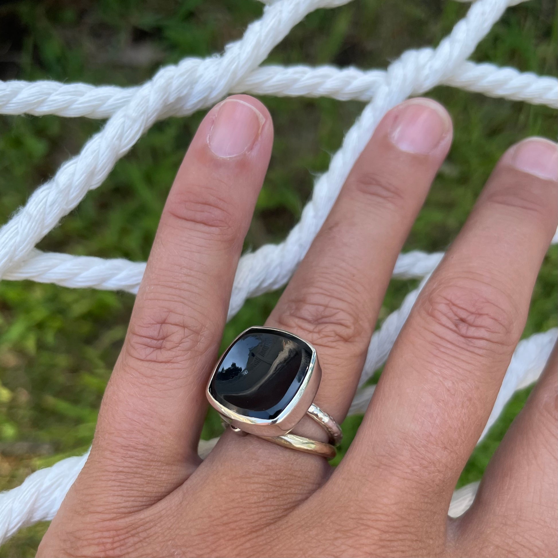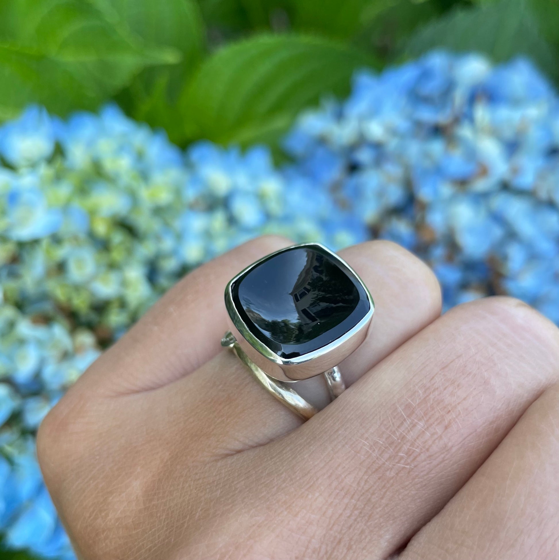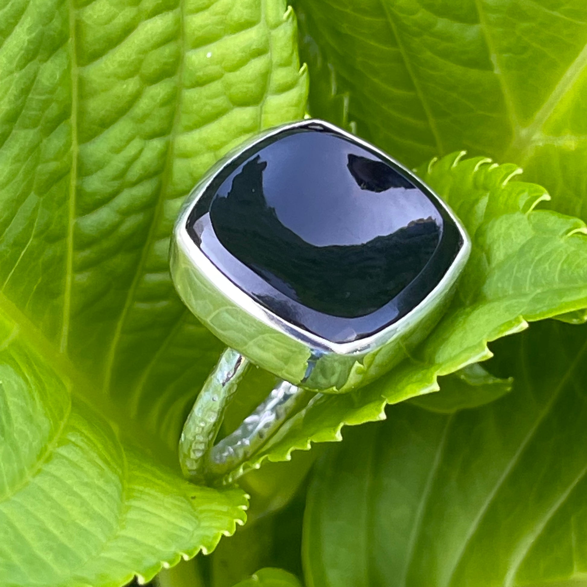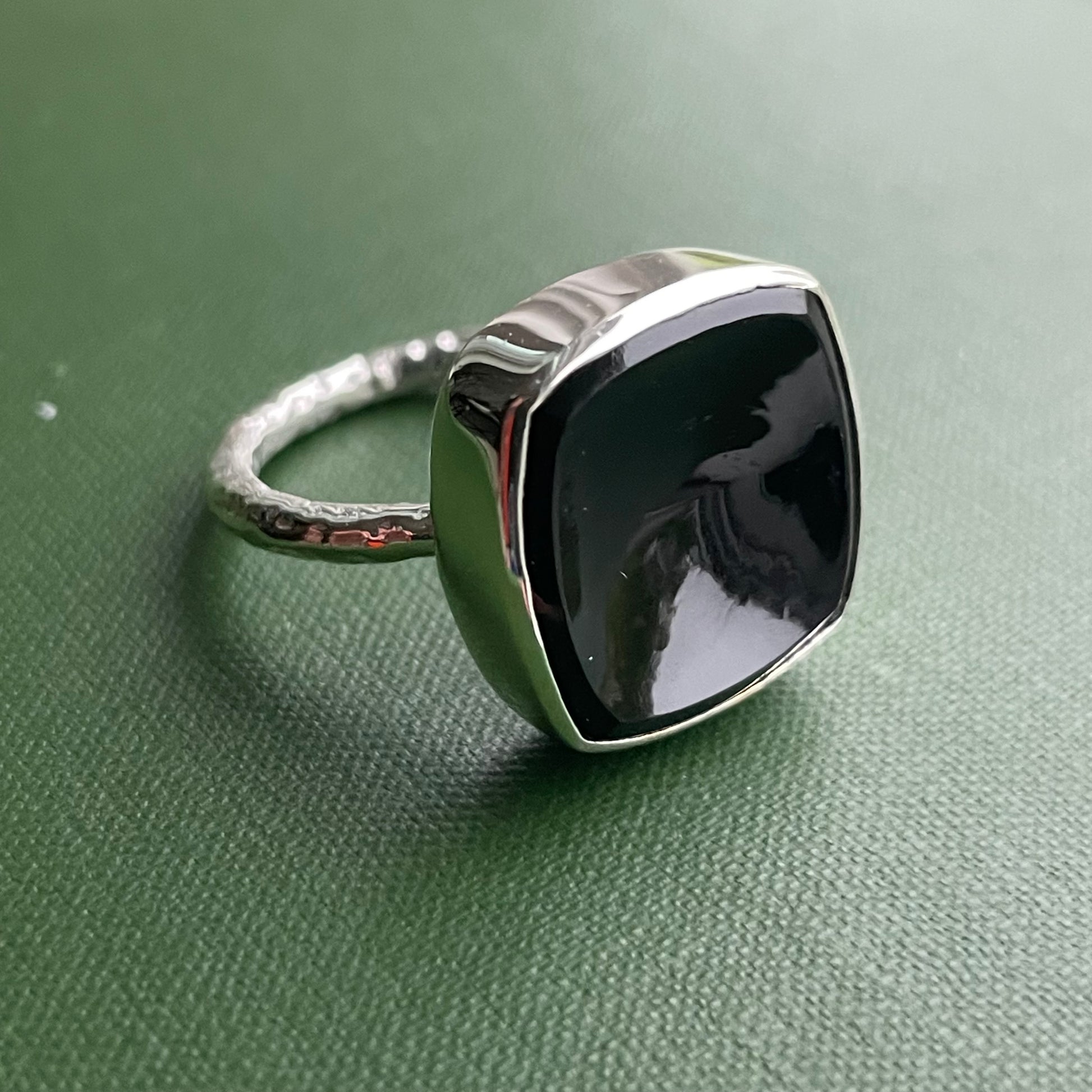 This exclusive Black Onyx Ring features a 16mm Concave Cut Black Onyx Cushion, bezel set in sterling silver on a 2mm round hammered band. The back is open to touch the skin, and imprinted with 925 as a stamp of the sterling's authenticity and durability. Available in whole and half sizes. Designed in Massachusetts and handcrafted in India, with high quality materials and ethically sourced stones.