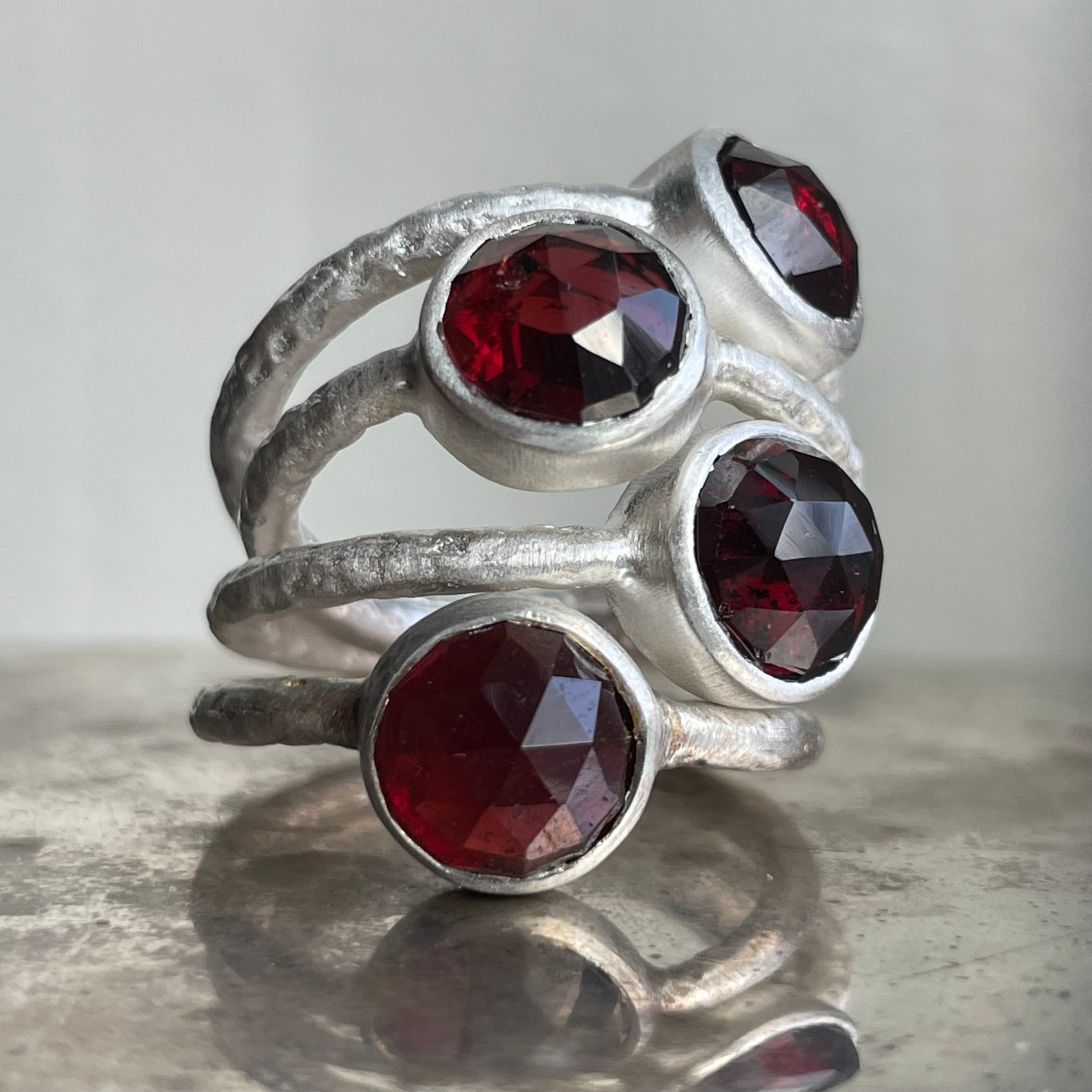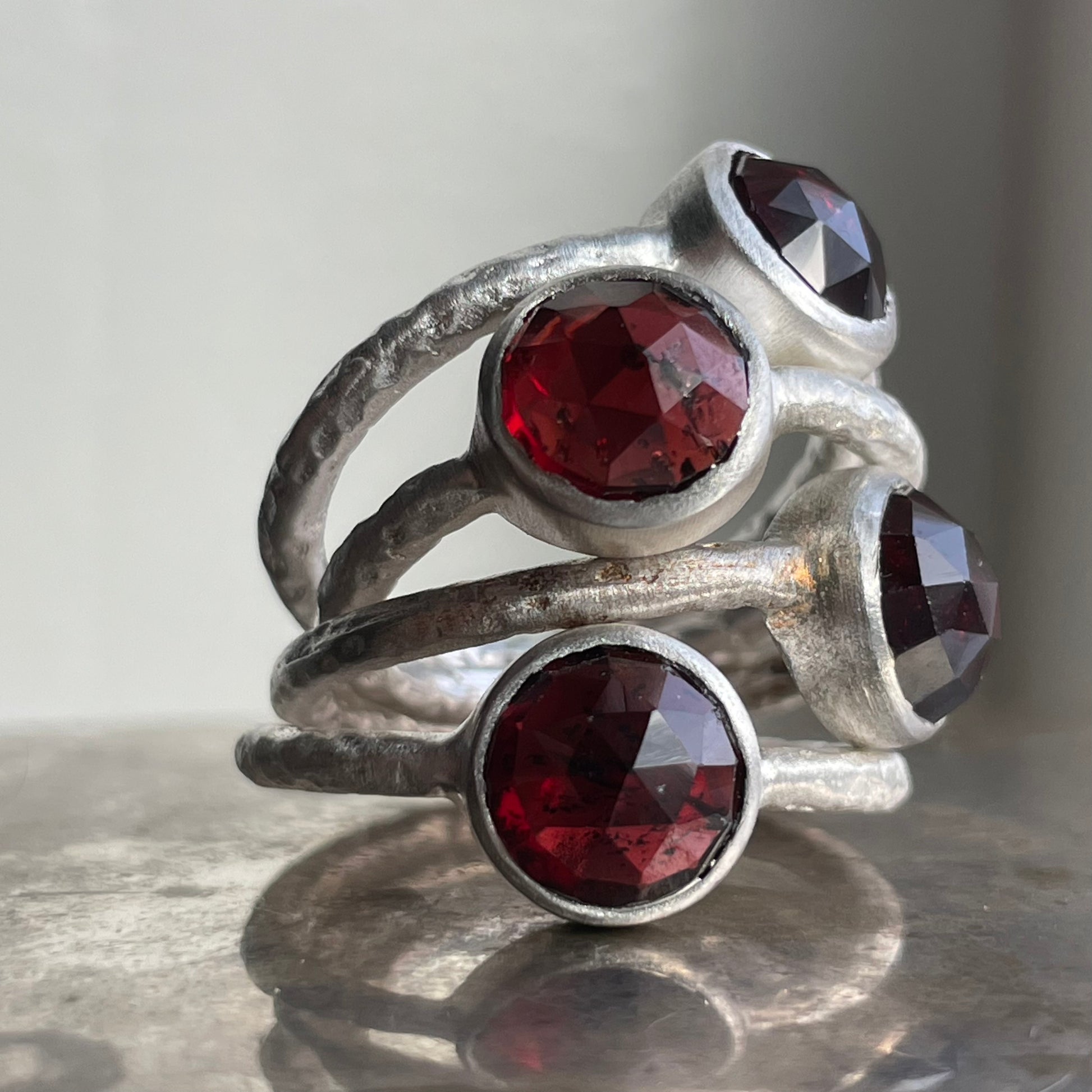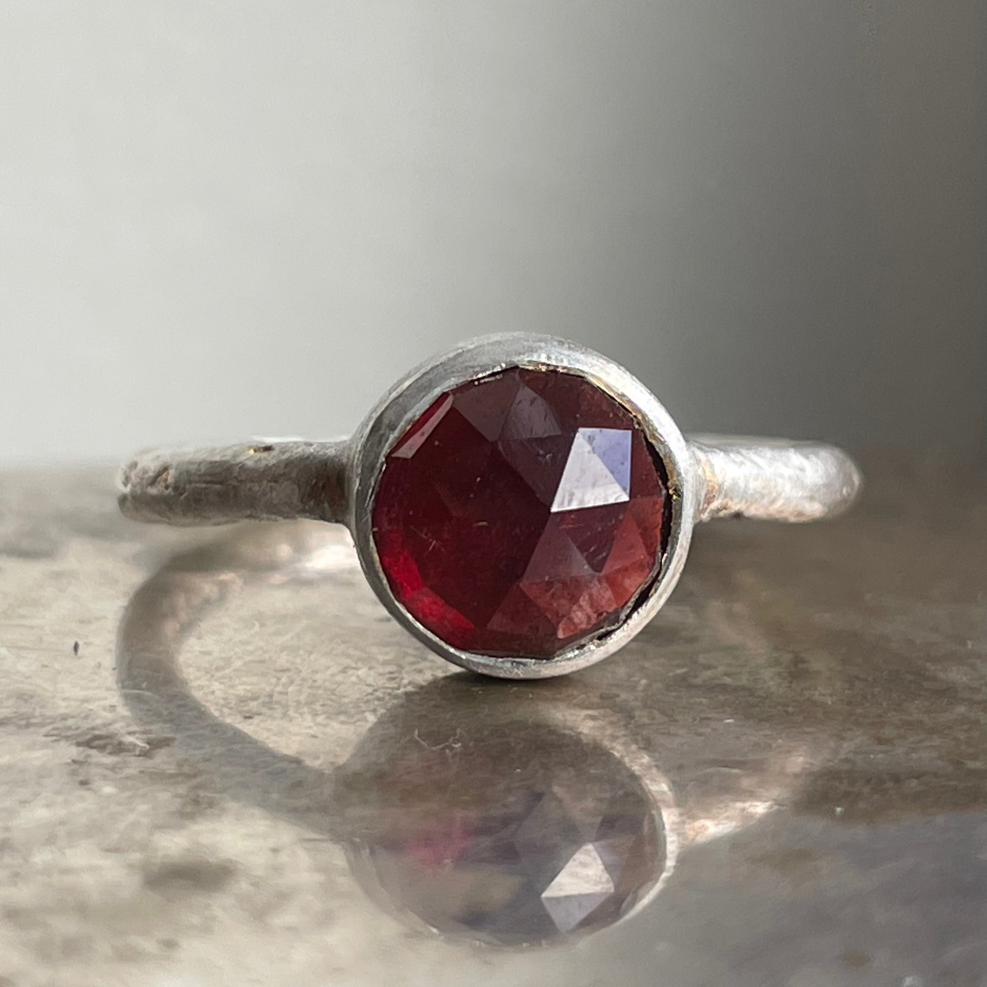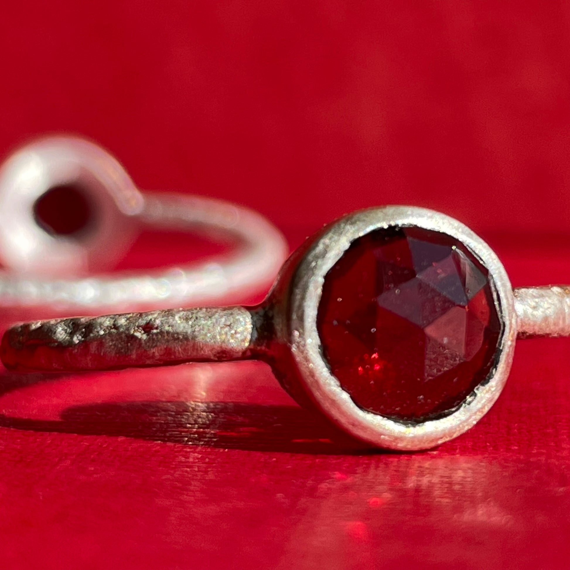 This exclusive Garnet Ring features an 8mm checkered cut Garnet, bezel set in sterling silver, on a 2mm round hammered band. Back of the setting is imprinted with 925 as a stamp of the sterling's authenticity and durability and is open so the gem can touch the skin. Available in whole and half sizes. Designed in Massachusetts and handcrafted in India, with high quality materials and ethically sourced stones.
