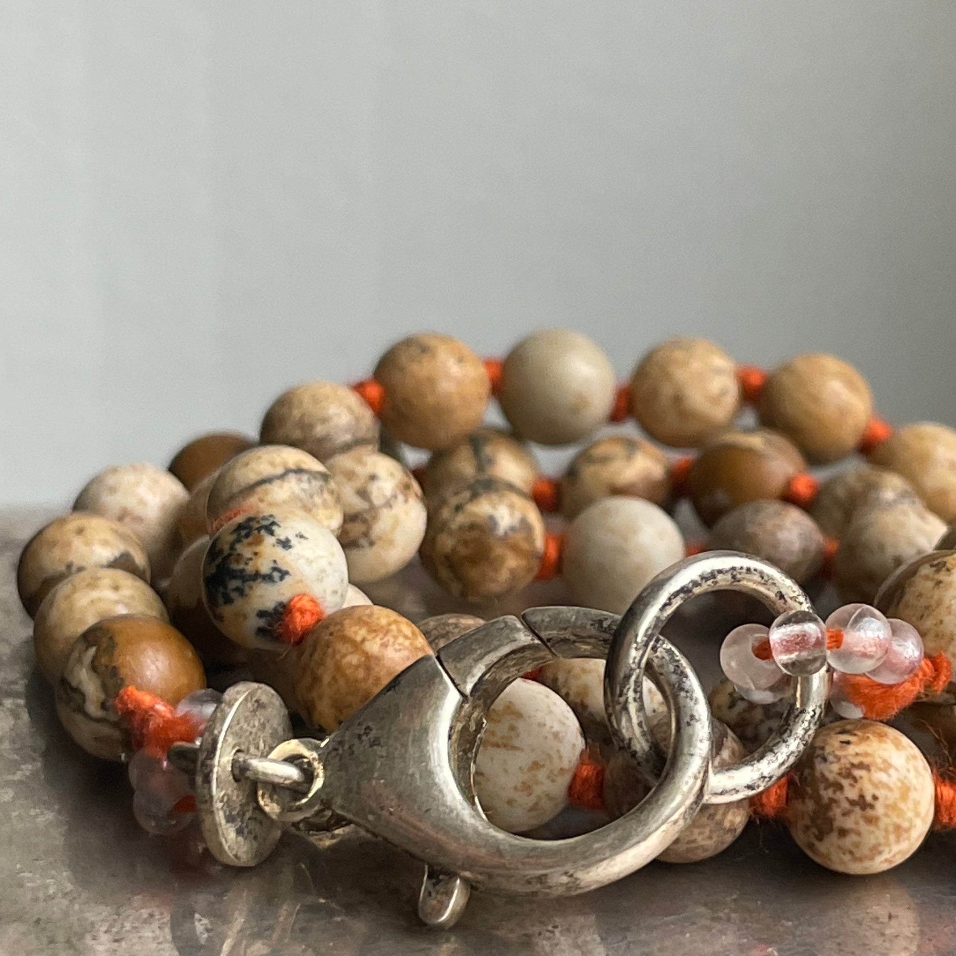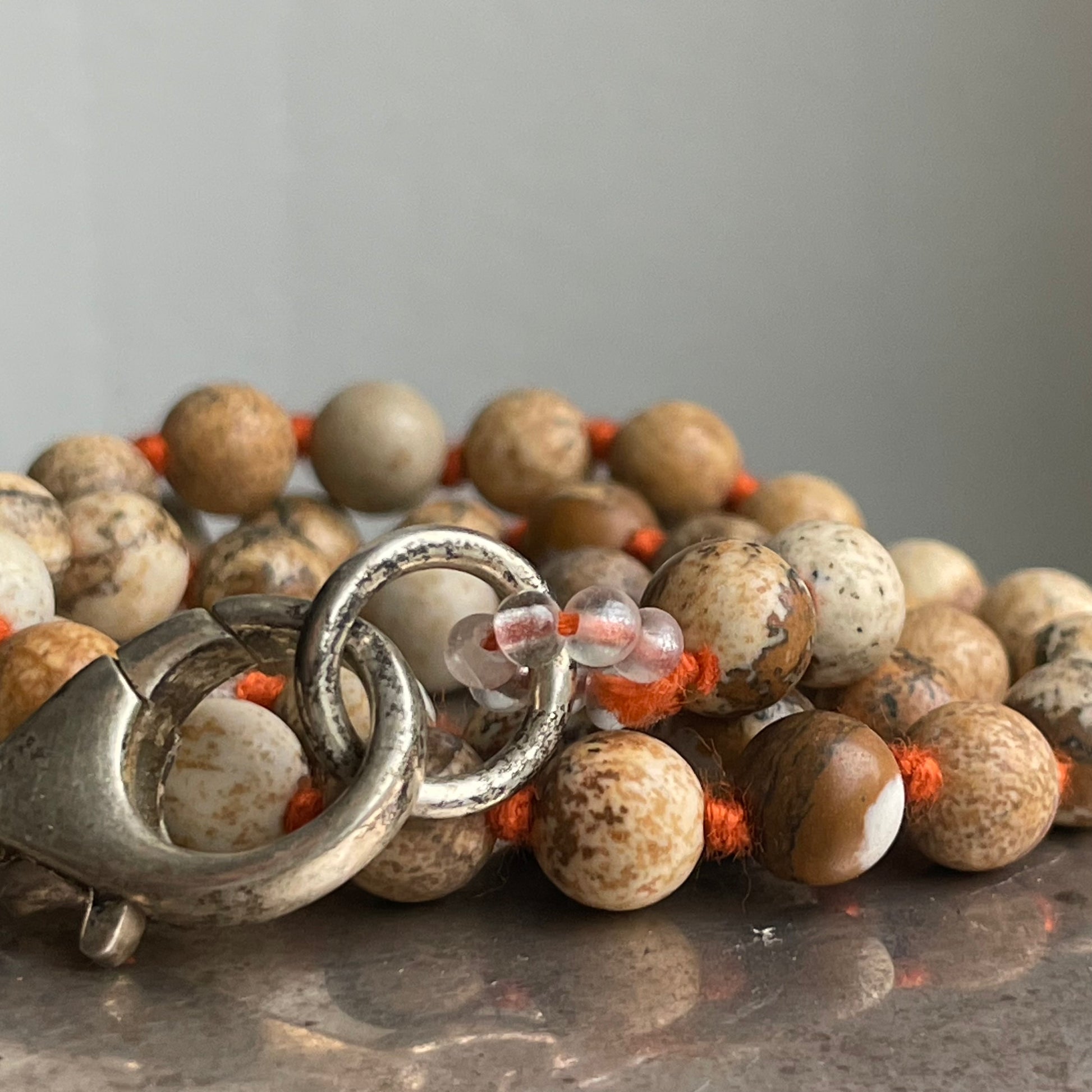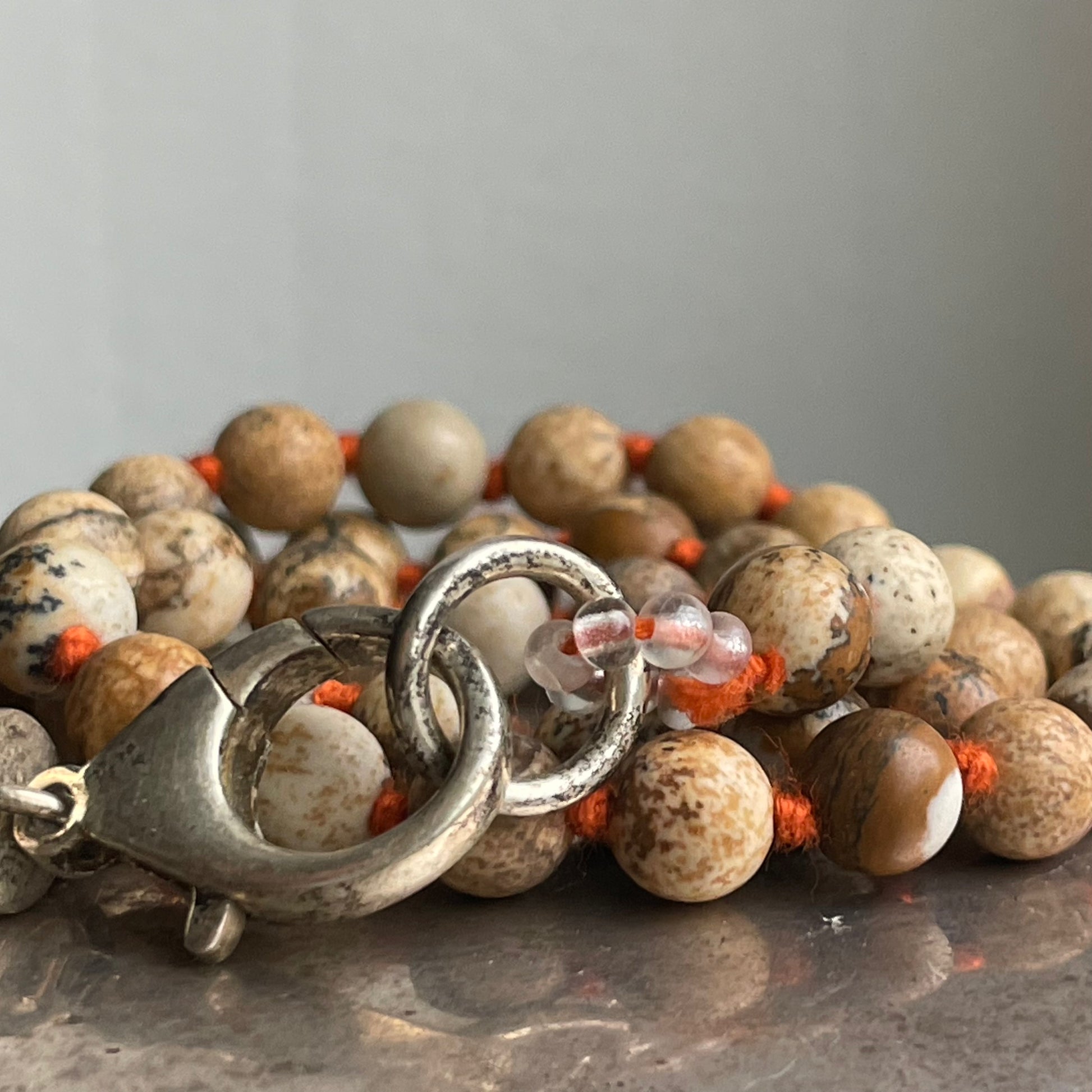 This exclusive Picture Jasper Matte Necklace features 14" (35cm) of 6mm Matte Picture Jasper beads, carefully strung on cotton thread, with knots between each bead for the most comfortable wear. Finished with a 20mm sterling silver lobster clasp, printed 925 to mark the durability of the sterling silver. Can be worn as a necklace or doubled as a bracelet. Designed in Massachusetts and handcrafted in Jaipur, India, with high-quality materials and ethically sourced stones. Authentic and affordable.
