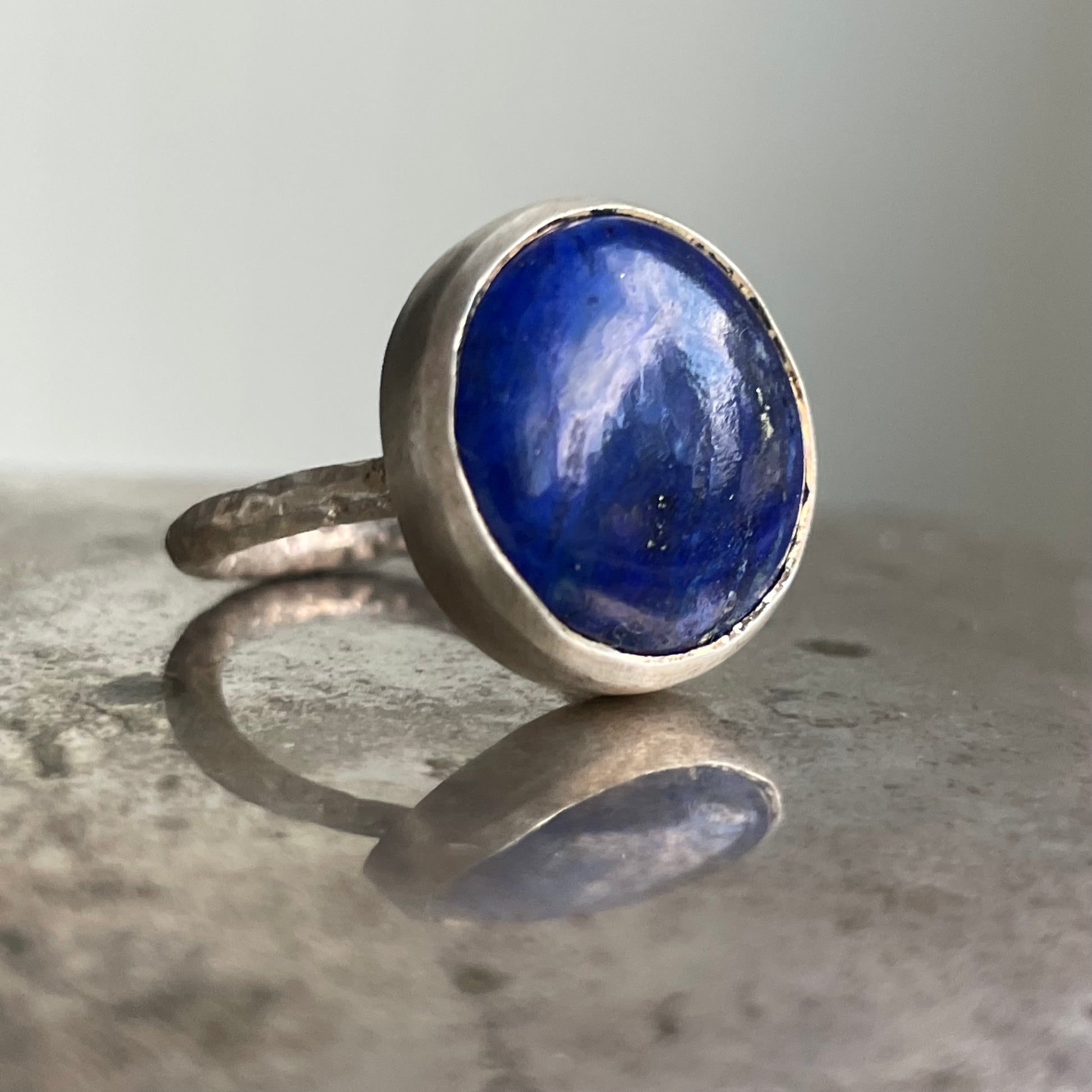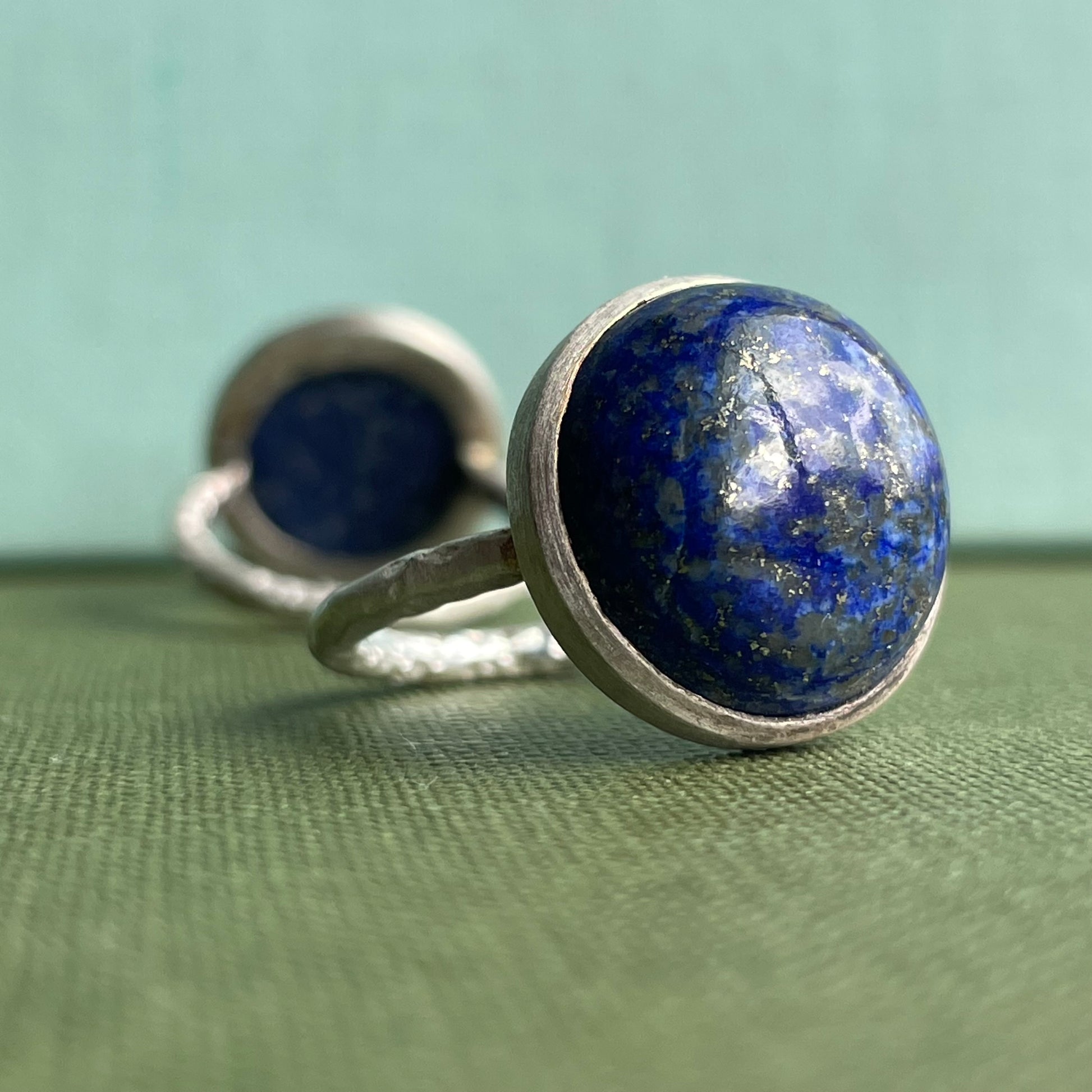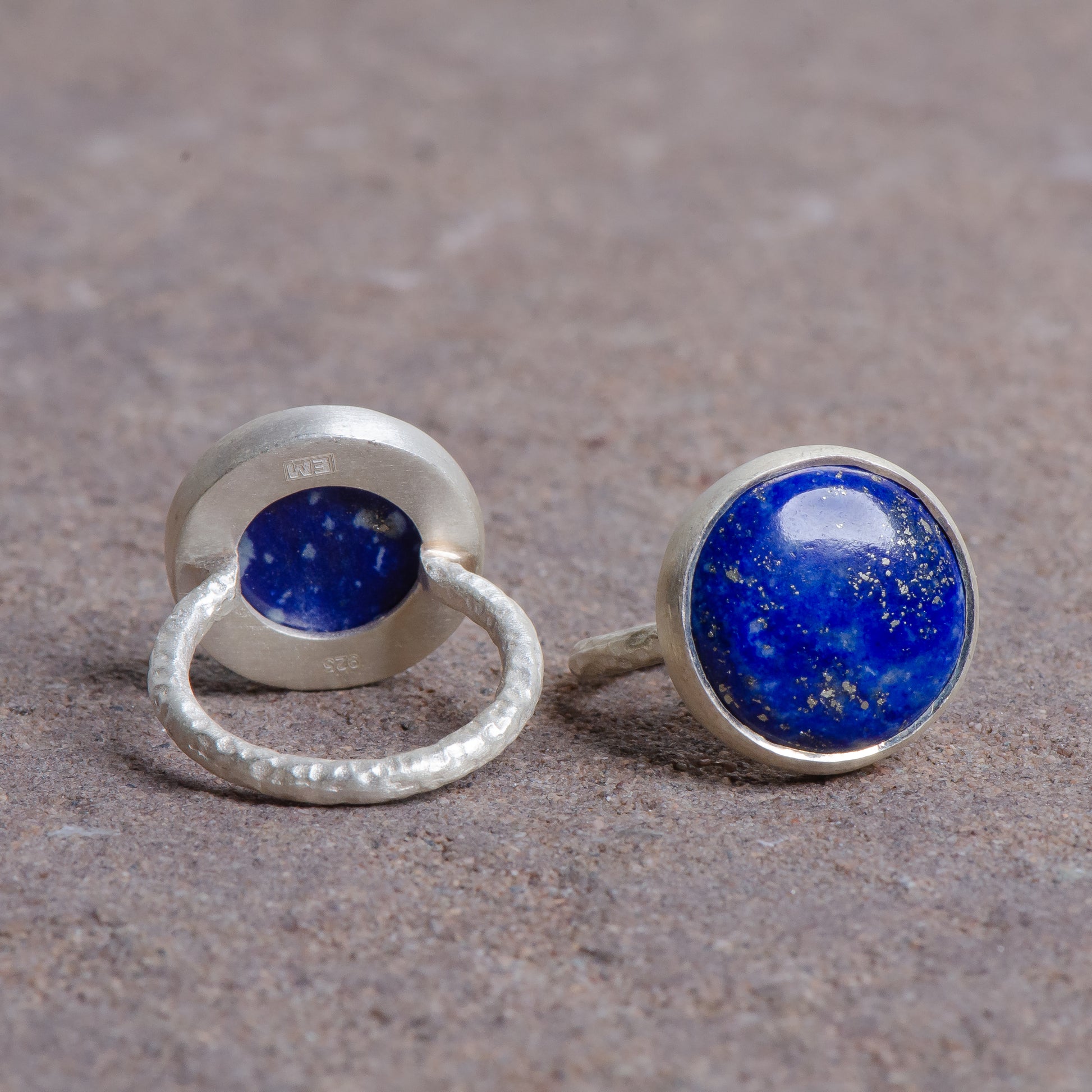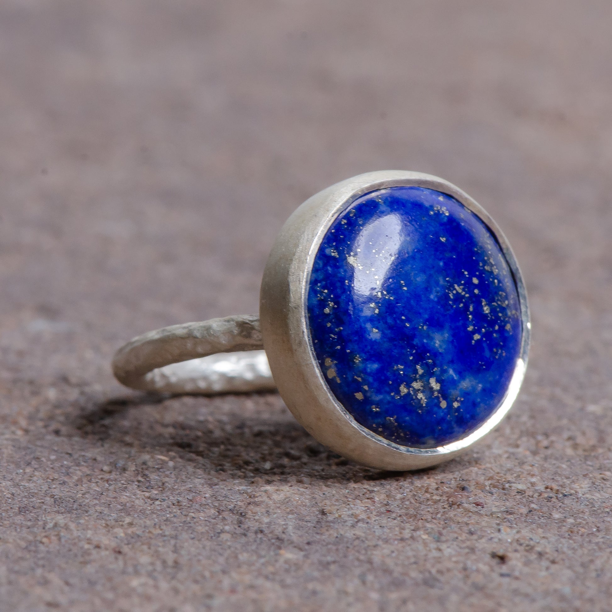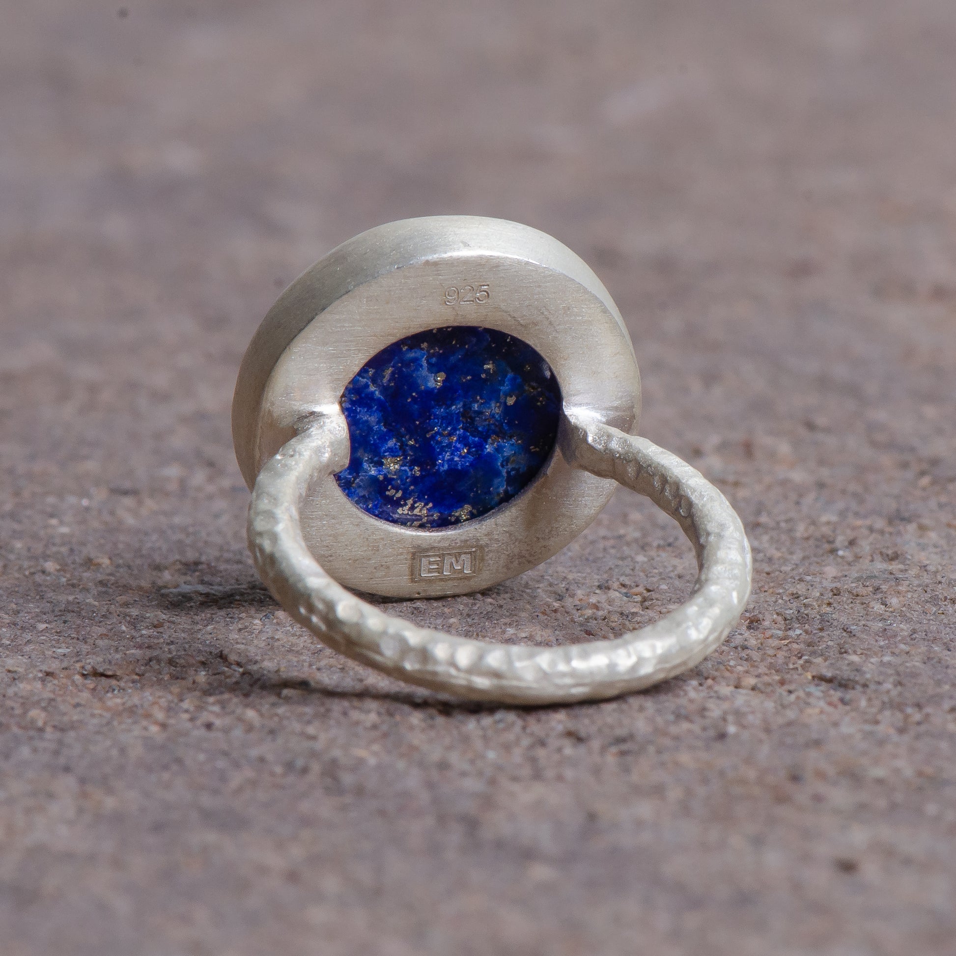 This exclusive Lapis Lazuli Ring features a round 16mm Lapis Lazuli Cabochon. Bezel set in matte finish sterling silver, on a 2mm round hammered band. The back is imprinted with 925 as a stamp of the sterling's authenticity and durability. Available in whole and half sizes. Designed in Massachusetts and handcrafted in India, with high quality materials and ethically sourced stones.