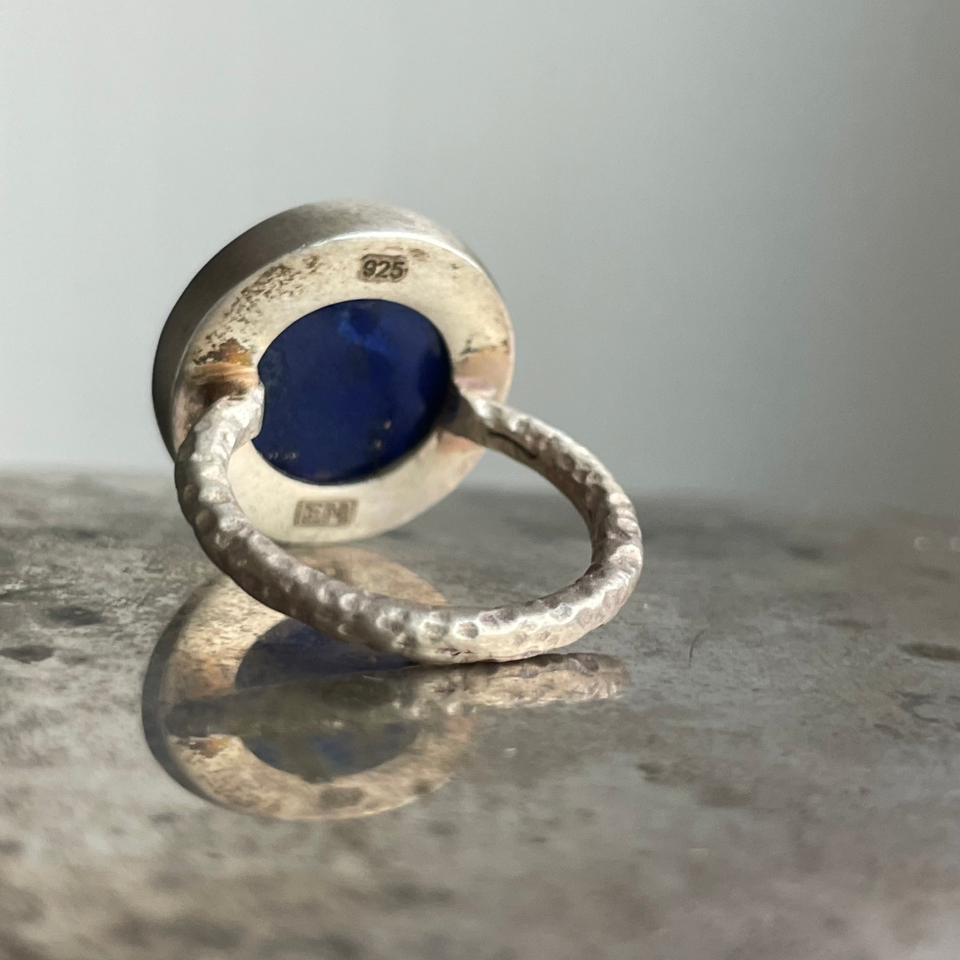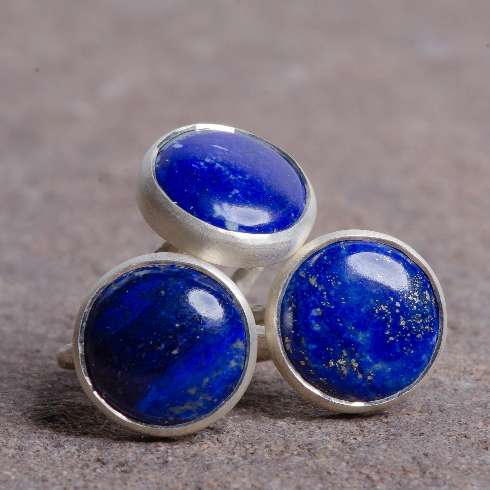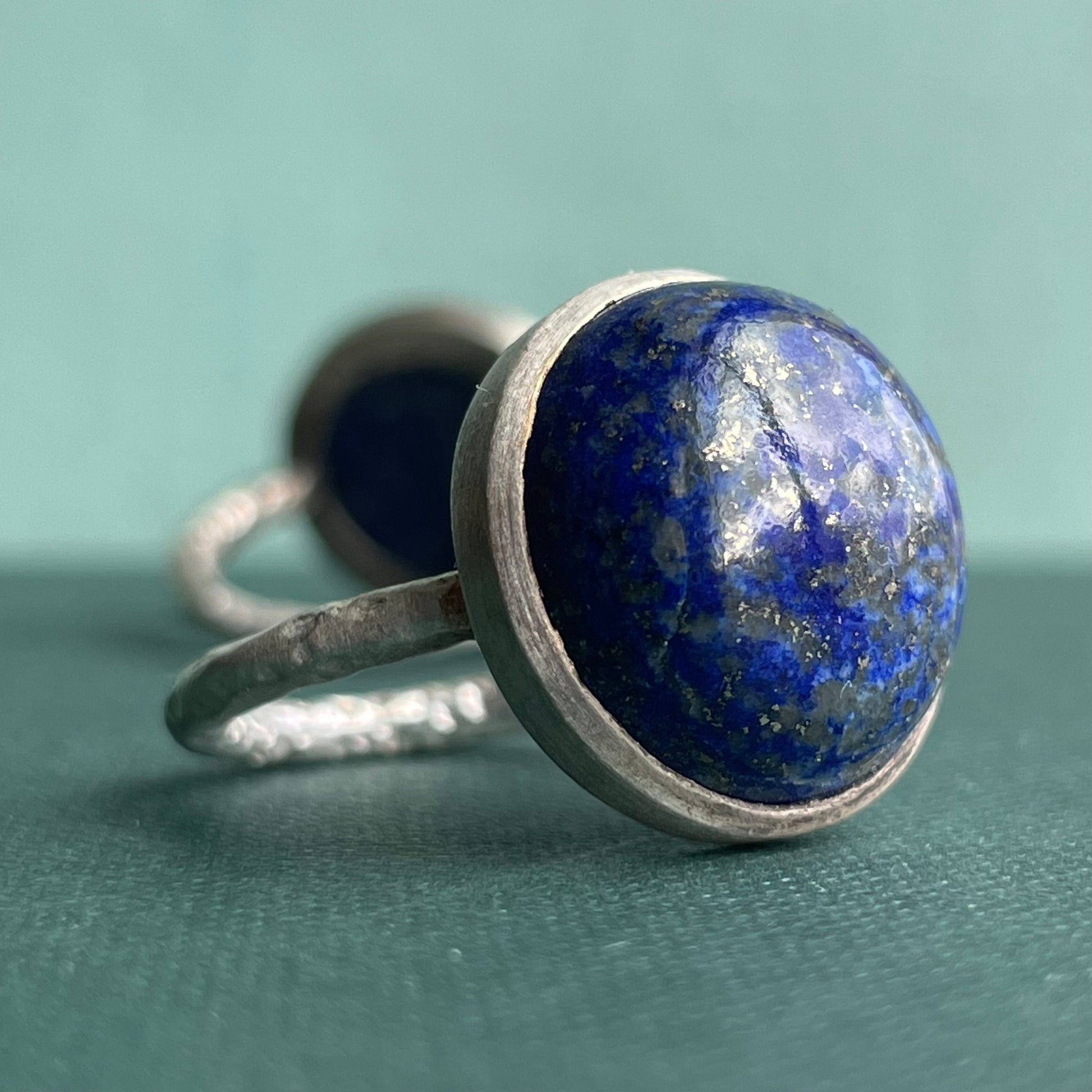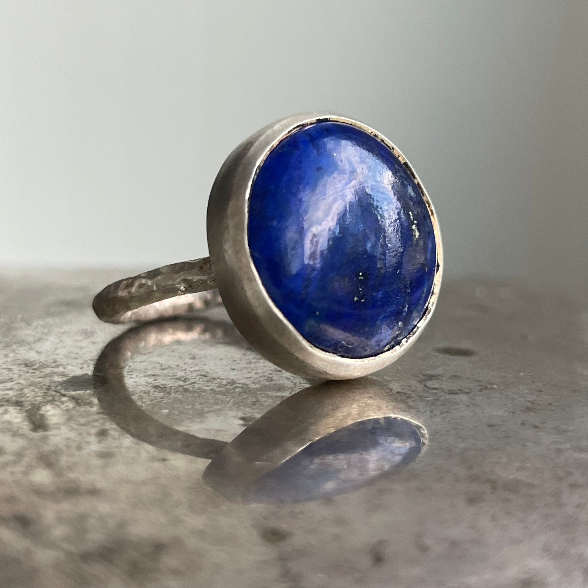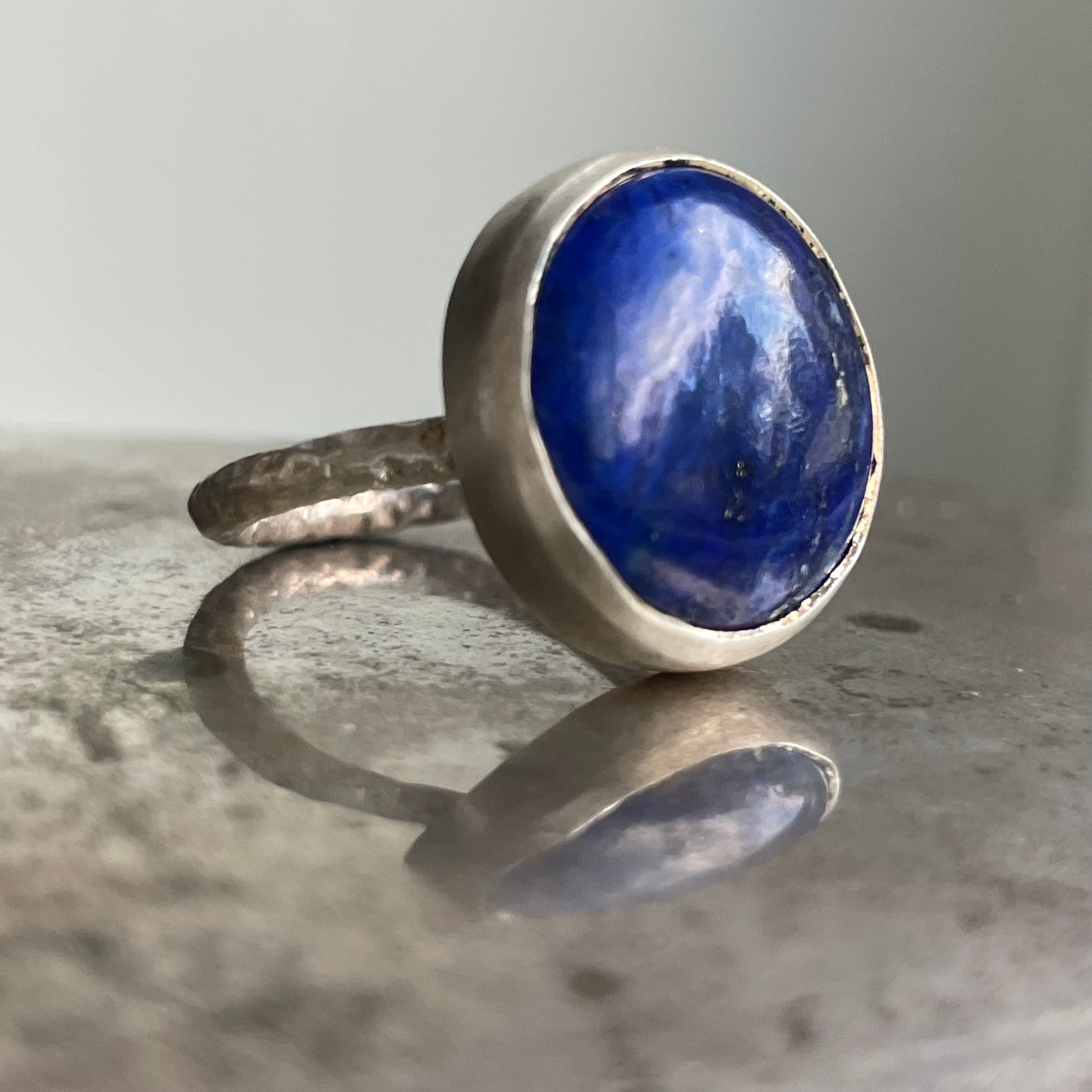This exclusive Lapis Lazuli Ring features a round 16mm Lapis Lazuli Cabochon. Bezel set in matte finish sterling silver, on a 2mm round hammered band. The back is imprinted with 925 as a stamp of the sterling's authenticity and durability. Available in whole and half sizes. Designed in Massachusetts and handcrafted in India, with high quality materials and ethically sourced stones.