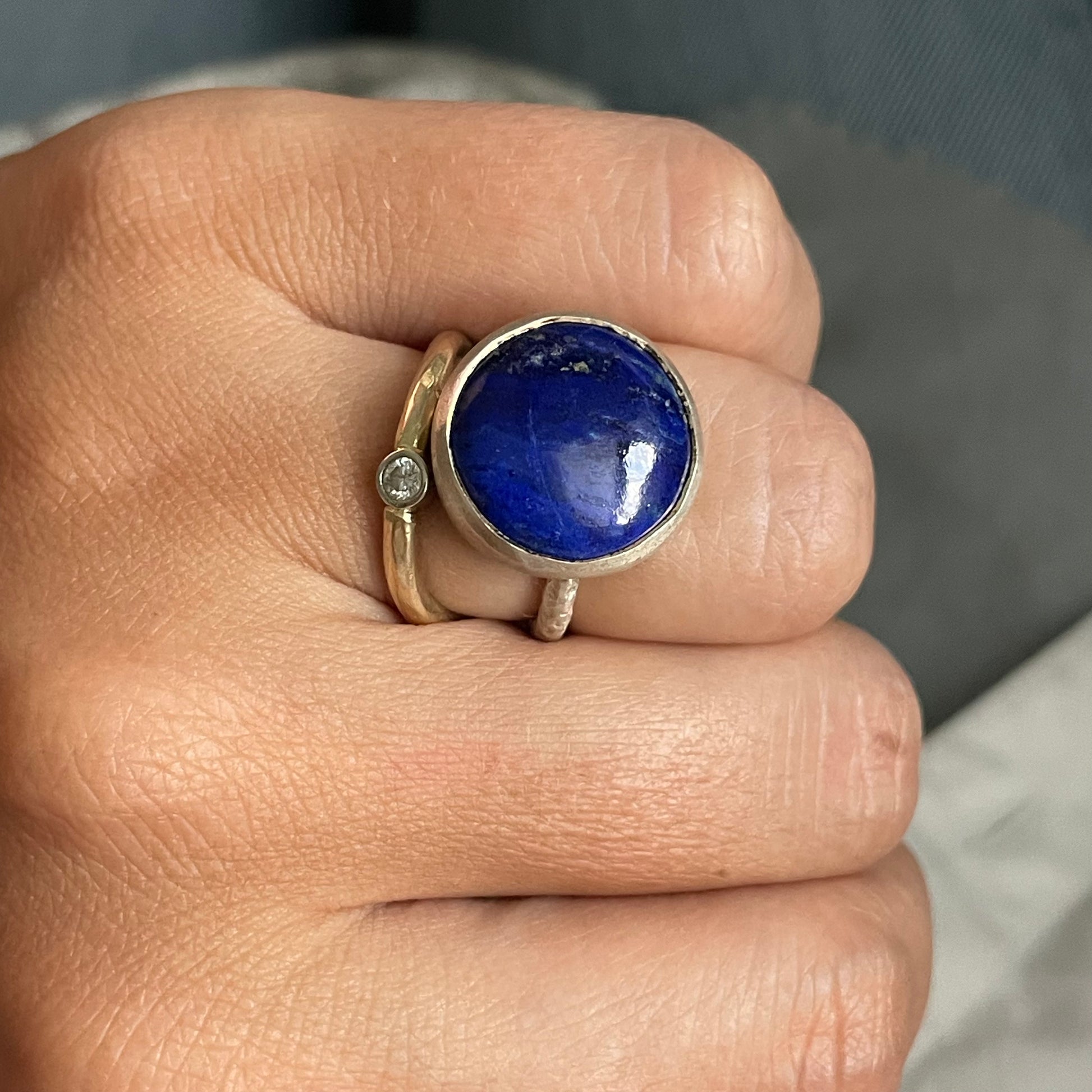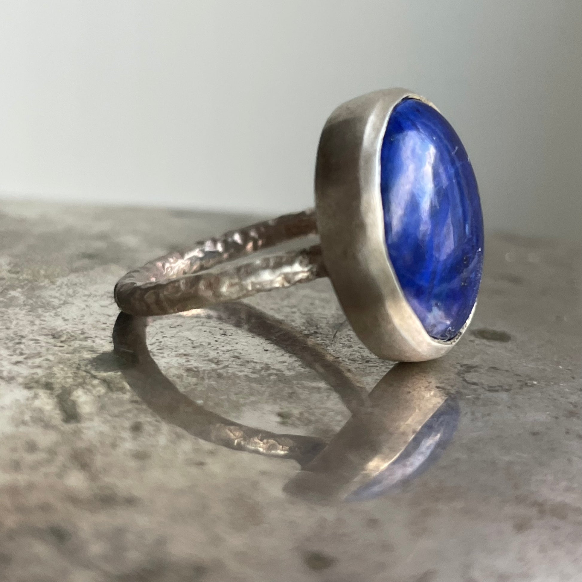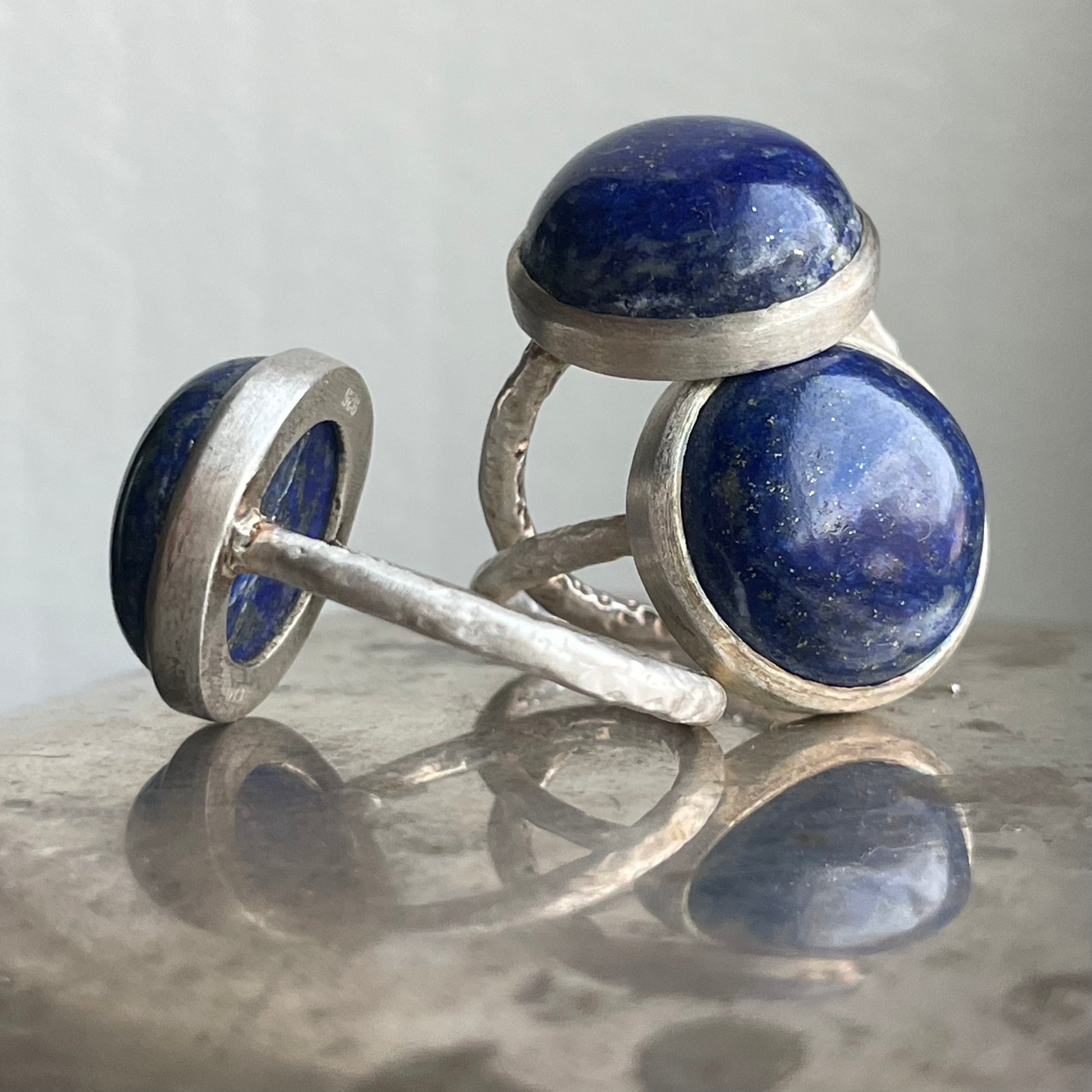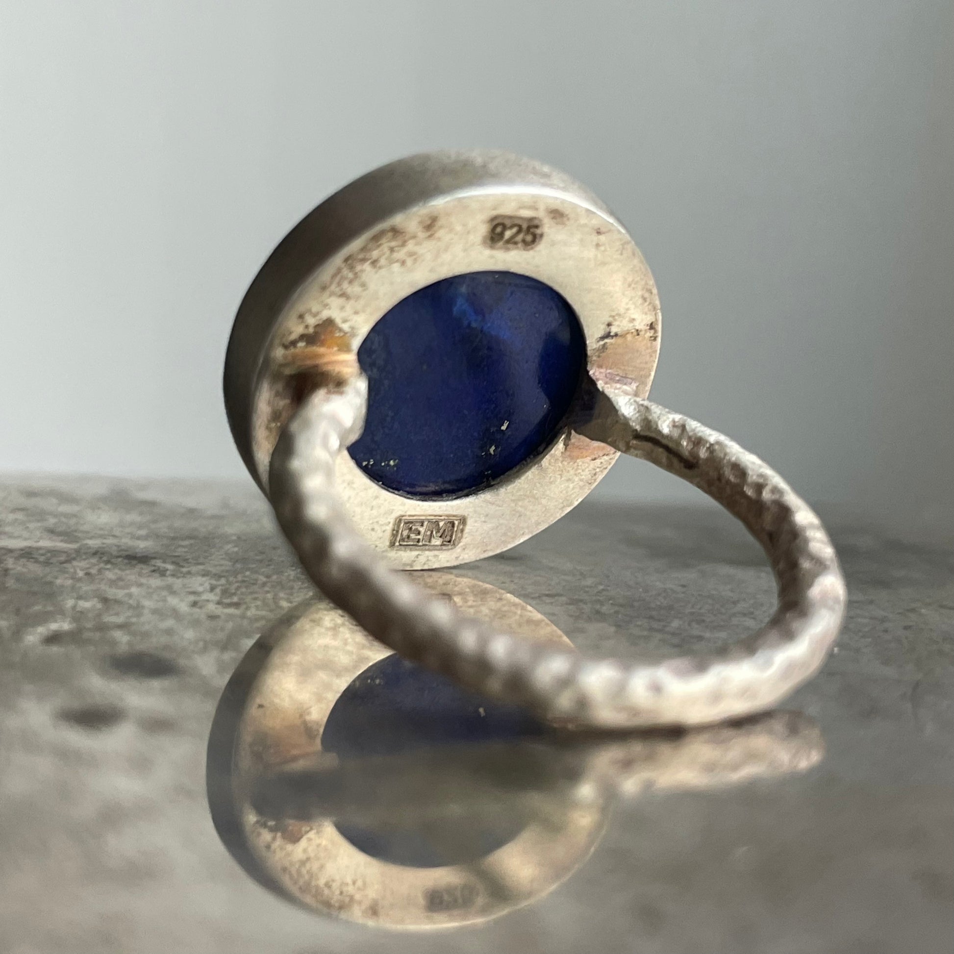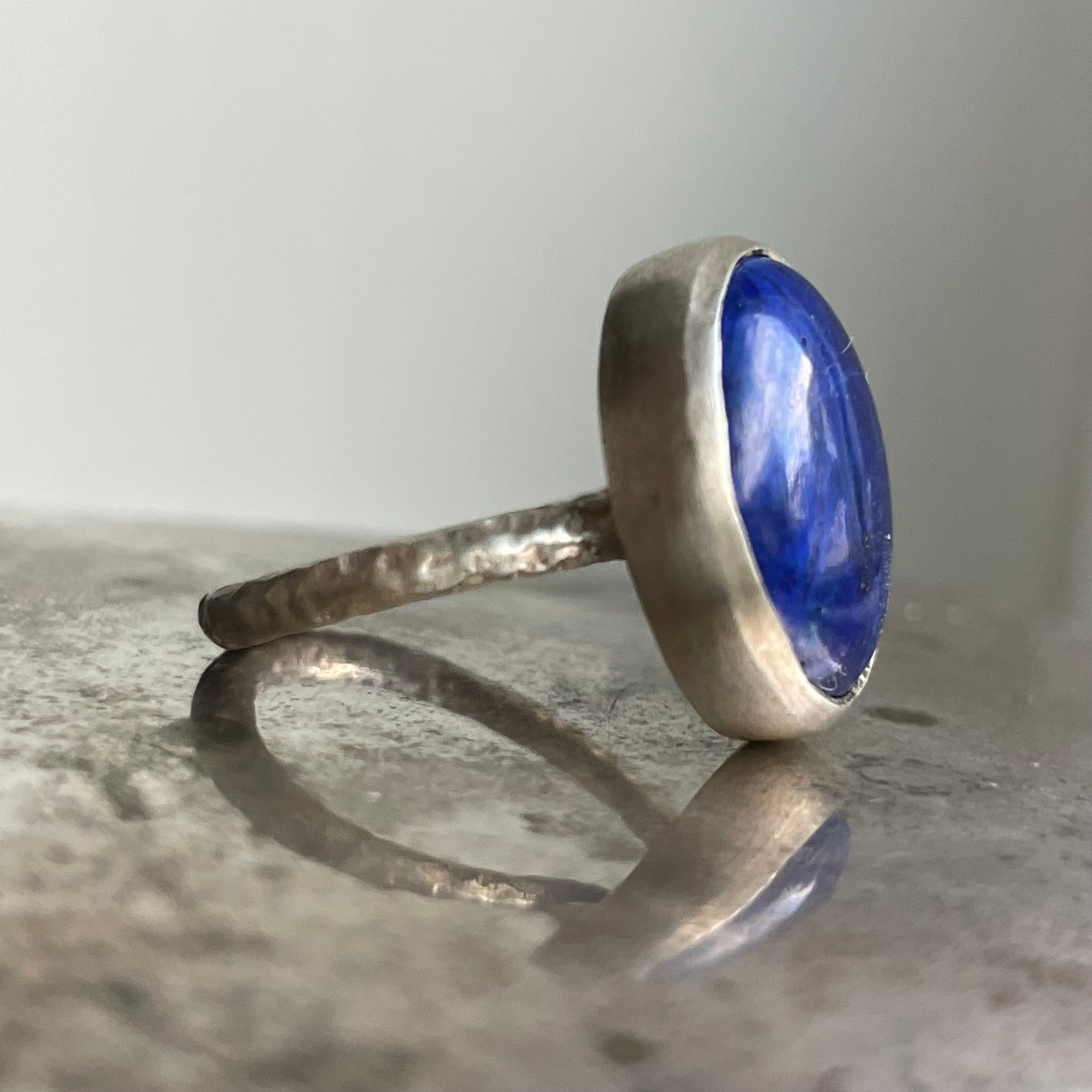 This exclusive Lapis Lazuli Ring features a round 16mm Lapis Lazuli Cabochon. Bezel set in matte finish sterling silver, on a 2mm round hammered band. The back is imprinted with 925 as a stamp of the sterling's authenticity and durability. Available in whole and half sizes. Designed in Massachusetts and handcrafted in India, with high quality materials and ethically sourced stones.