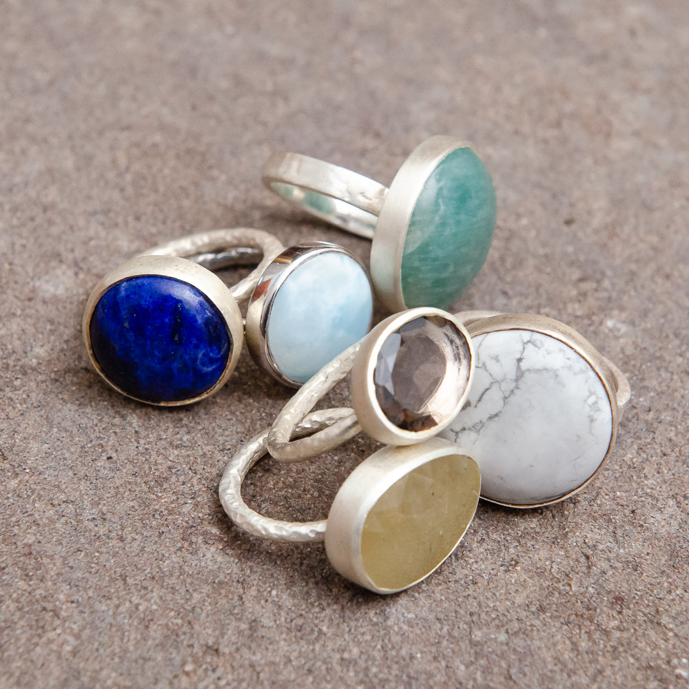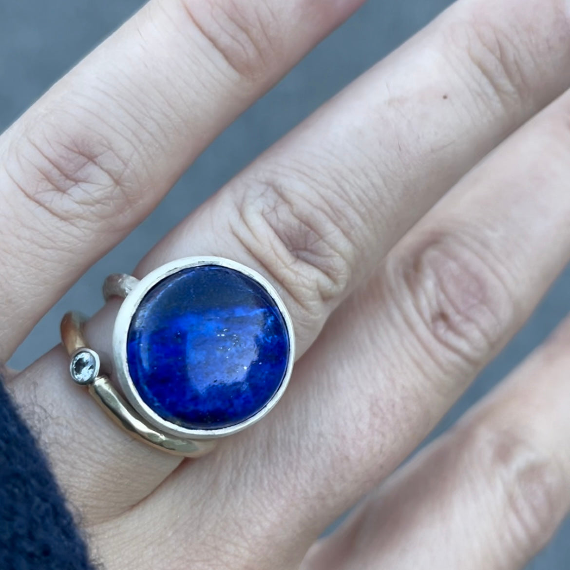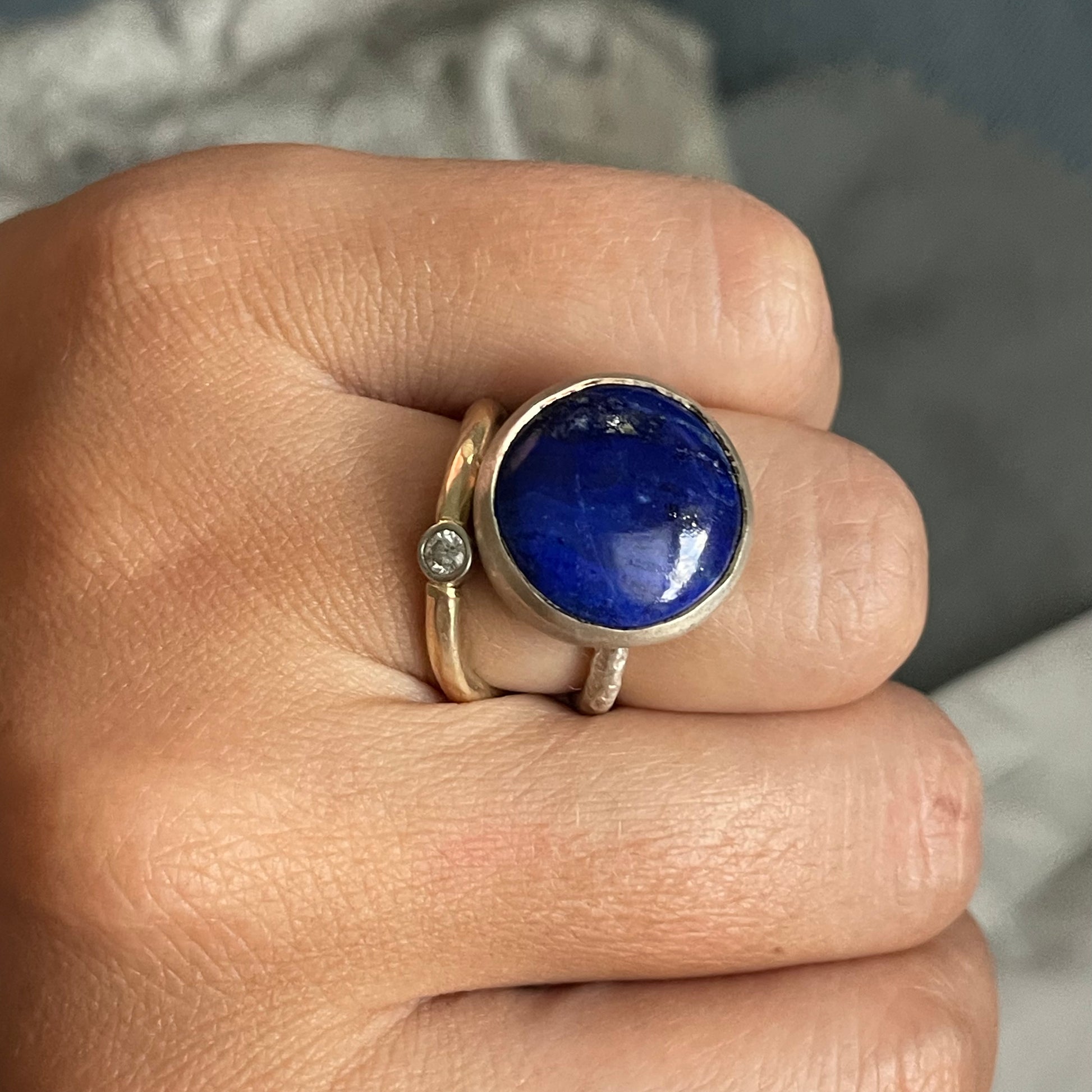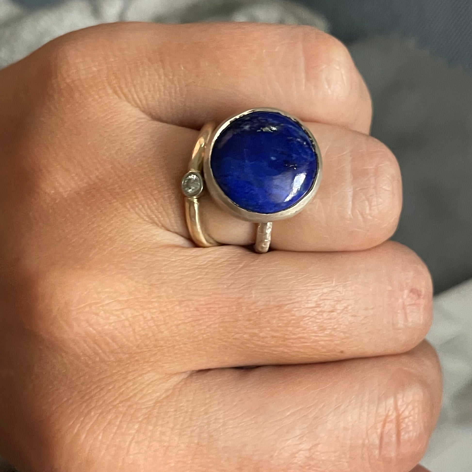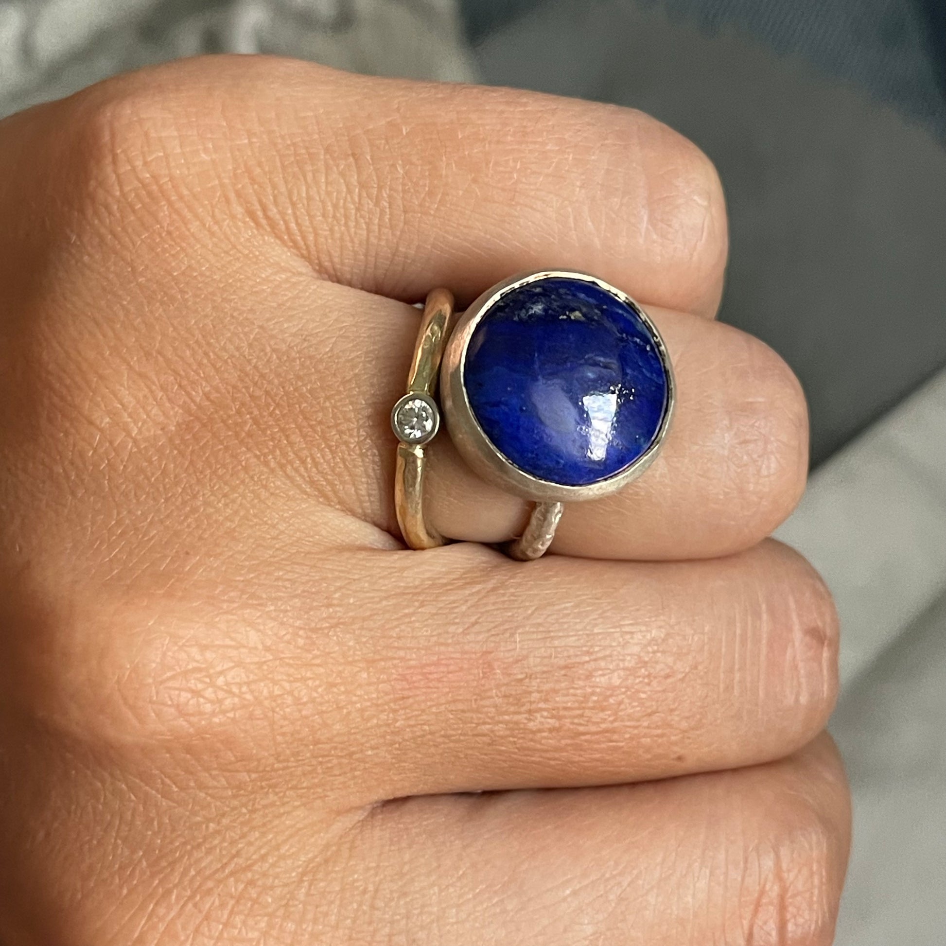 This exclusive Lapis Lazuli Ring features a round 16mm Lapis Lazuli Cabochon. Bezel set in matte finish sterling silver, on a 2mm round hammered band. The back is imprinted with 925 as a stamp of the sterling's authenticity and durability. Available in whole and half sizes. Designed in Massachusetts and handcrafted in India, with high quality materials and ethically sourced stones.