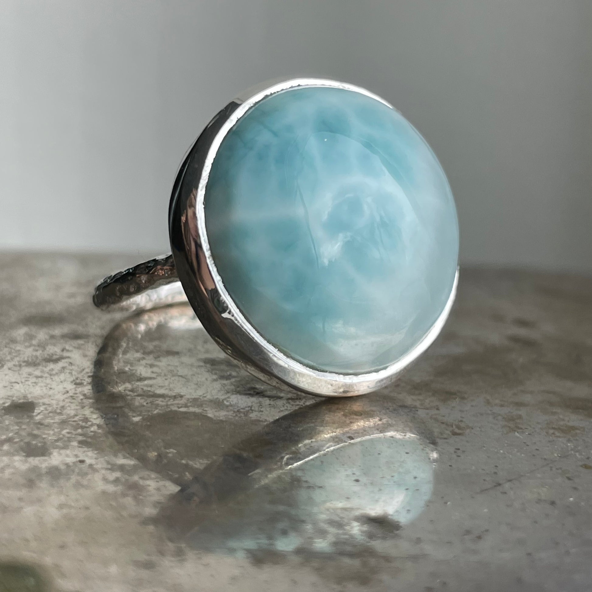 This exclusive Larimar Ring features a 20mm Larimar Cabochon. Bezel set in sterling silver on a 2mm round hammered band. Inner band is imprinted with 925 as a stamp of the sterling's authenticity and durability. Available in whole and half sizes. Designed in Massachusetts and handcrafted in India, with high quality materials and ethically sourced stones.