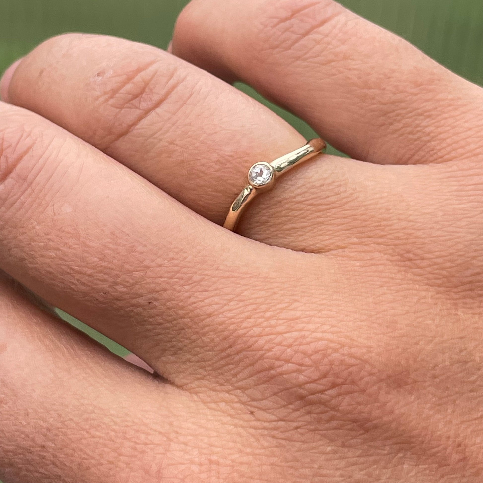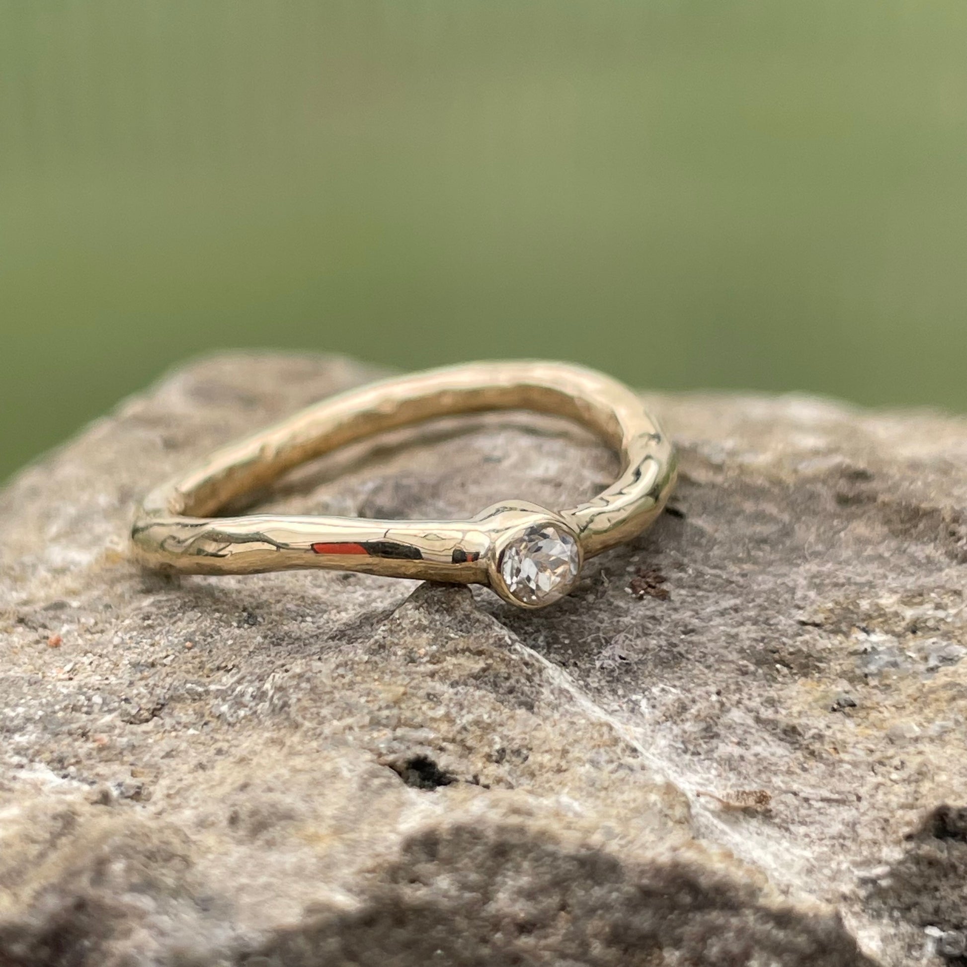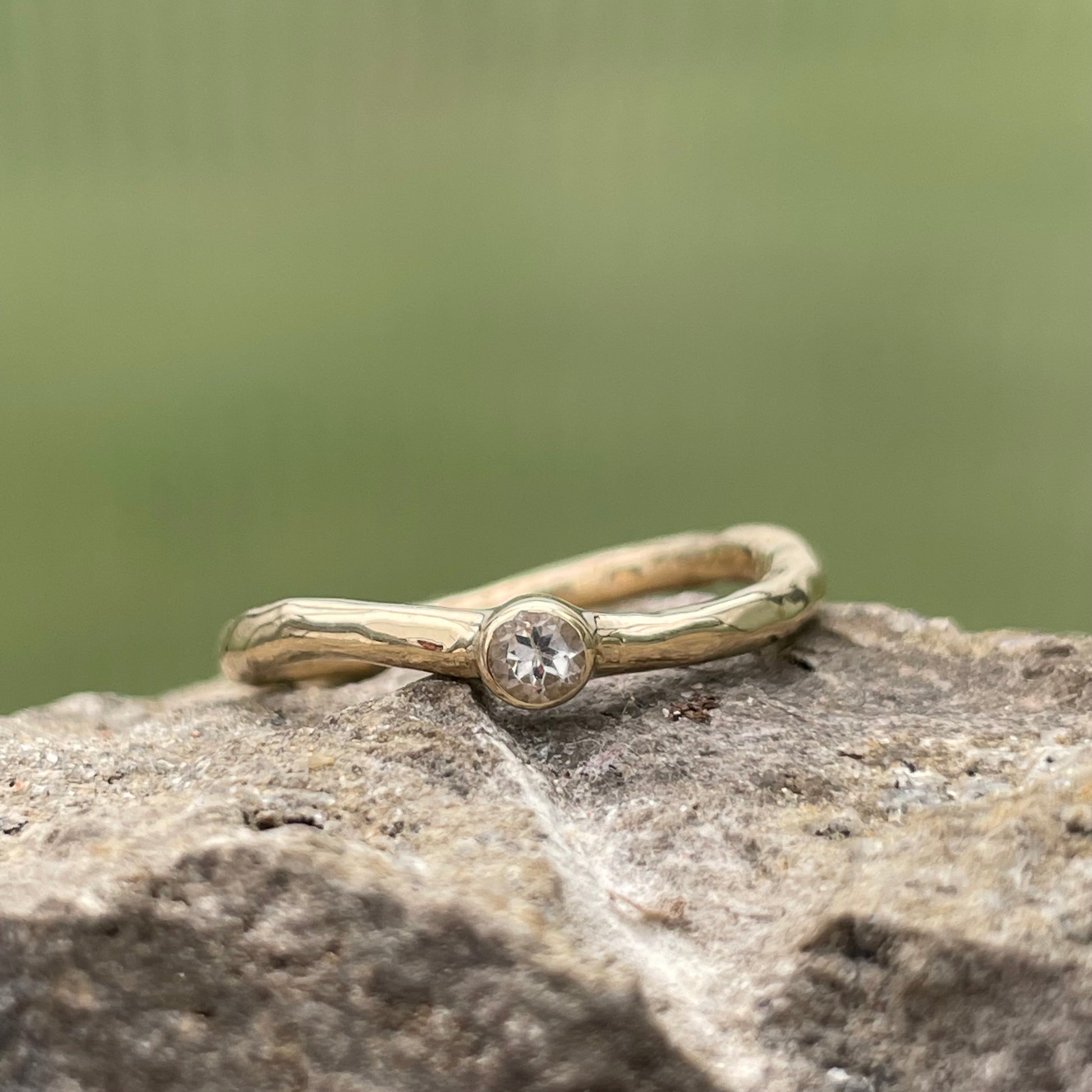 3mm white topaz set in a 2mm round hammered 14k gold band with a slight wave shape.